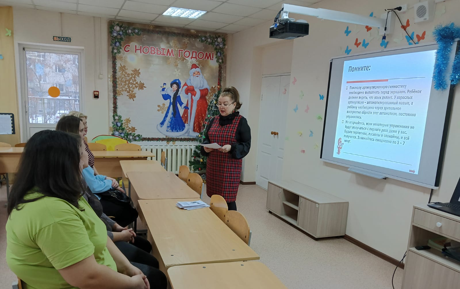 14.12.2024 на занятии в «Школе для родителей», логопед Светлана Николаевна рассказала родителям об играх и упражнениях, способствующих развитию речи детей, давала рекомендации, как развивать ребенка дома и закреплять полученный материал. Педагог поделился своим опытом, ответила на вопросы. Родители получили буклеты с играми и упражнениями. Проблема развития речи у детей остро чувствуется в настоящее время, особенно при поступлении ребенка в школу. Неправильно произнося звуки, ученик пишет с ошибками, скудный словарный запас мешает в восприятии нового материала, дети не умеют красиво выразить свои мысли. Поэтому уже «с пеленок» необходимо развивать речь ребенка. В этом велика роль родителей!