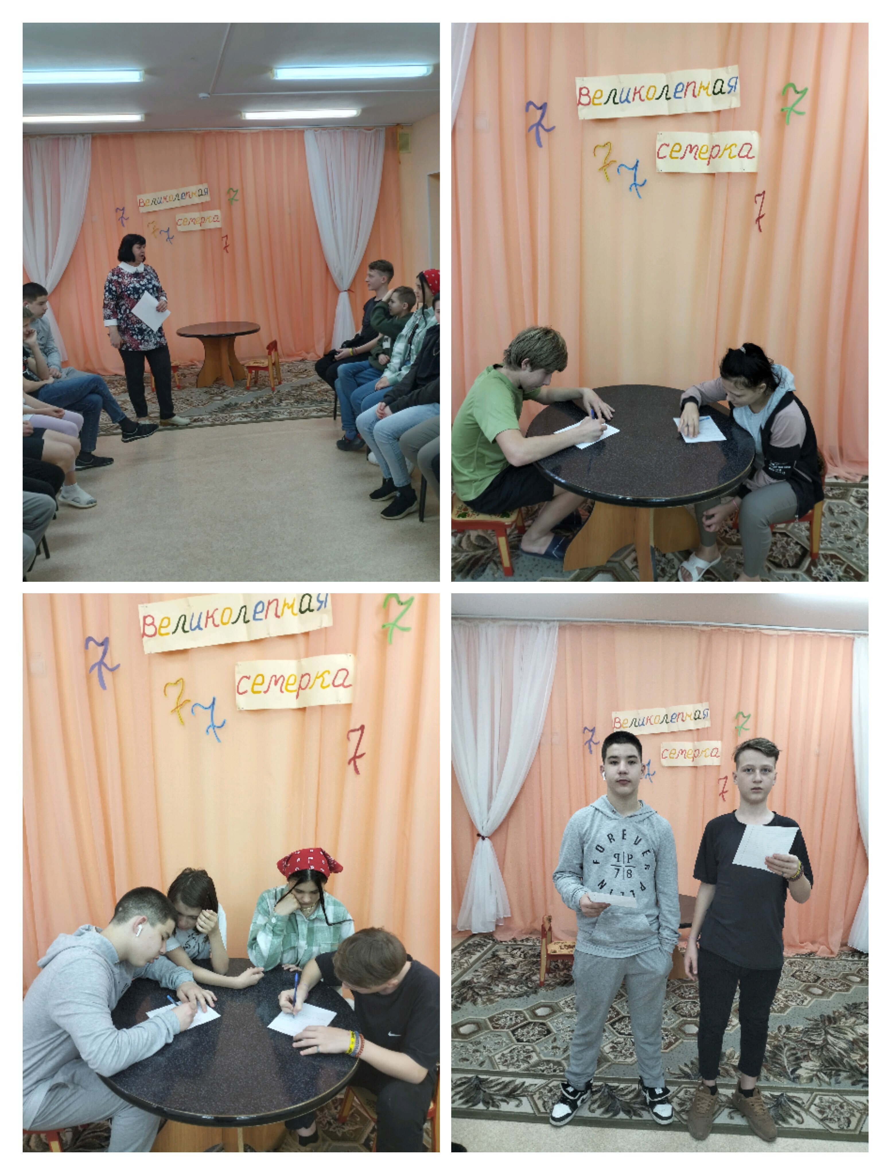 В отделении социального приюта прошла познавательно - игровая программа "Великолепная семёрка". В центре внимания была цифра 7. Не верите? Убедитесь сами. Началось с блиц - турнира, команды отвечали на 7 вопросов, команда состояла из 7 игроков, конкурсов было 7. Одним словом ребята хорошо отдохнули, узнали много нового и получили сладкие призы. Было здорово.