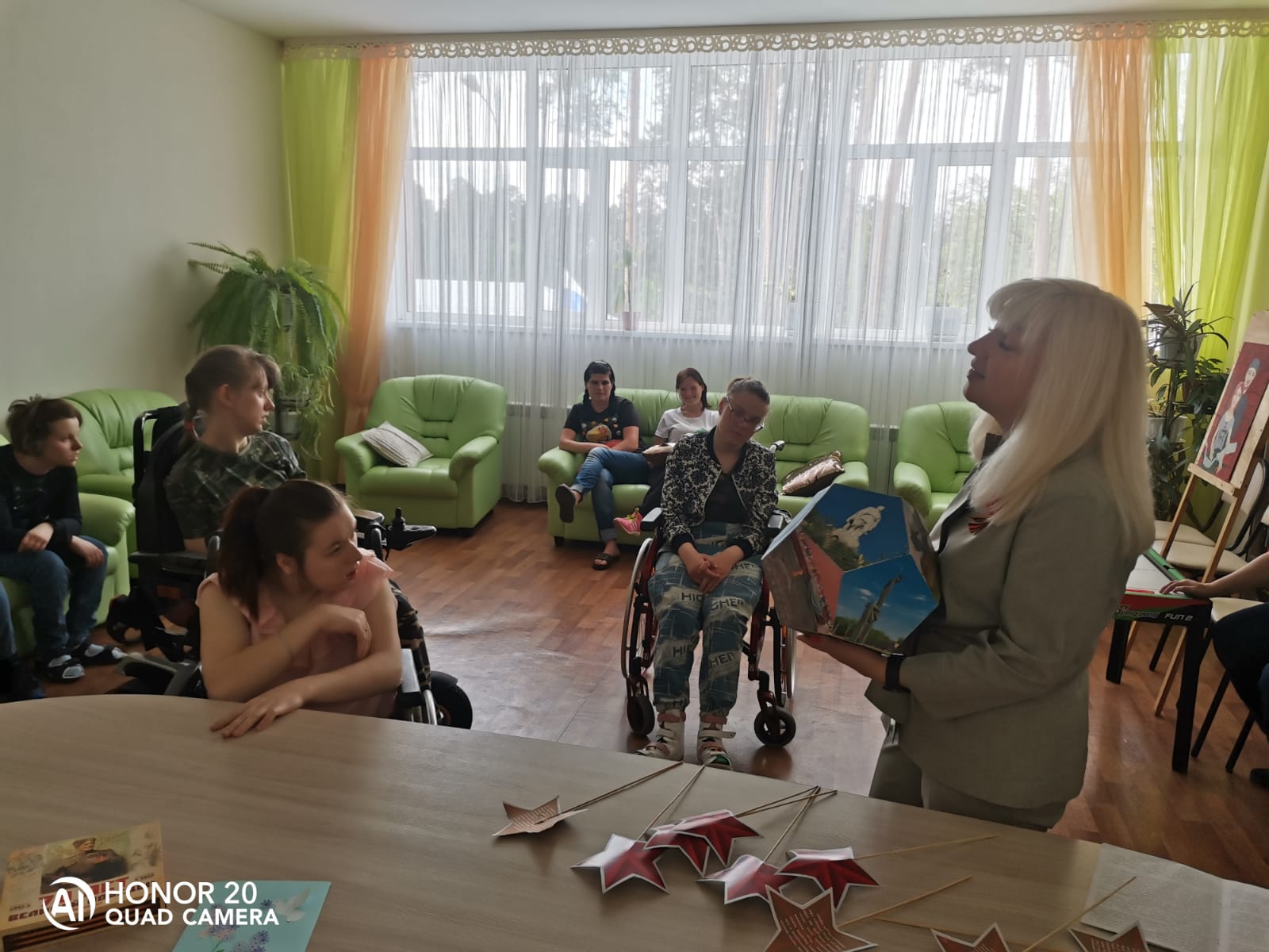 Есть у каждого народа события и даты, которые не забываются, но самый главный и великий только один – 9 мая, День Победы в Великой Отечественной войне. С целью воспитания патриотических чувств на ярких примерах героизма из жизни своих сверстников в годы Великой Отечественной войны, уважения памяти защитников нашей Родины в отделении сопровождаемого проживания было проведено расширенное мероприятие, которое включало в себя рассказ о памятниках, посвященных событиям прошедшей войны, изготовление поздравительных открыток для к 9 Мая, инфо-урок "Дети войны". Все мероприятие завершилось стрелковым поединком и мастер-классом по приготовлению солдатской каши. Молодые инвалиды выражают особую благодарность сотрудникам МУК Информационно-библиотечное объединение г. Заречный за содействие в проведении данного мероприятия.