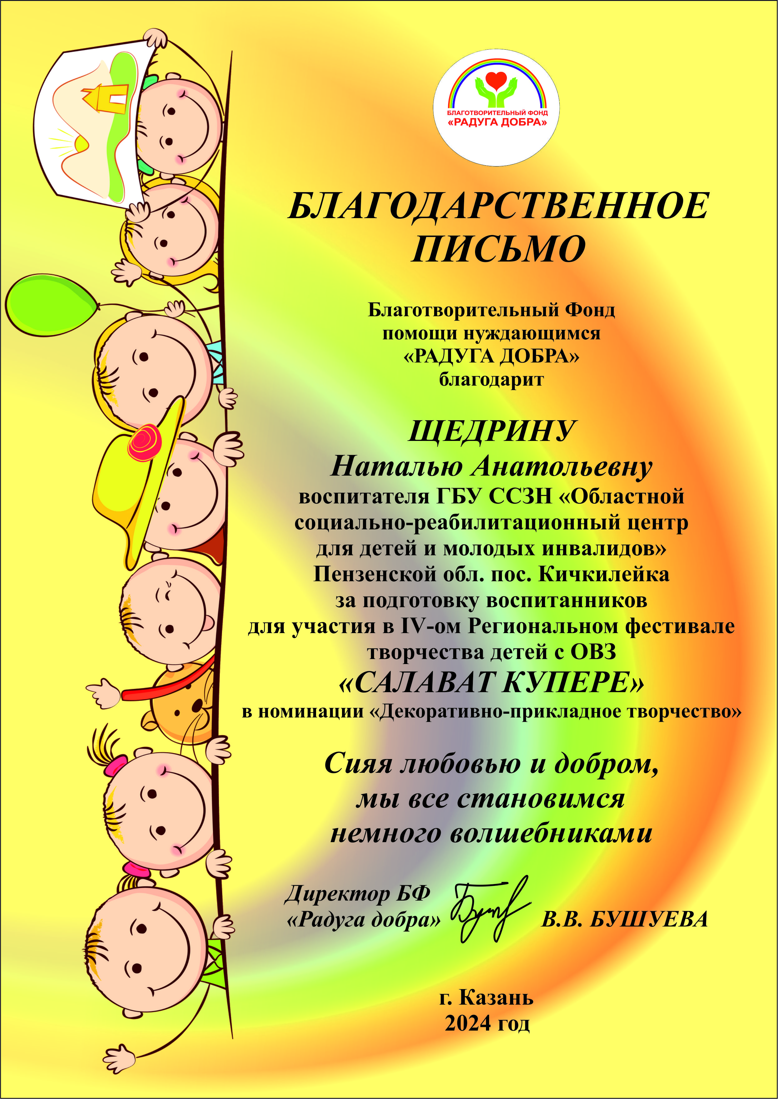 Маскаева Ирина, воспитанница отделения для детей с особенностями развития приняла участие в IV-ом Региональном фестивале творчества для детей с ограниченными возможностями здоровья (ОВЗ), под названием "Салават Купере". В рамках фестиваля Ирина проявила свои таланты в номинации "Декоративно - прикладное творчество". Благодаря своему творчеству и усилиям, Ирина была удостоена признания и поощрения. Ирина, Наталья Анатольевна Щедрина, воспитатель отделения для детей с особенностями развития и директор нашего центра - Елена Ивановна Воронкова, получили благодарственные письма, в знак признания их достижений на фестивале. Этот успех является свидетельством таланта и упорства Ирины, а также заслугой её наставников и педагогов, которые поддерживали и вдохновляли её на протяжении всего пути. Мы гордимся достижениями Ирины и желаем ей дальнейших успехов в творческом развитии!
