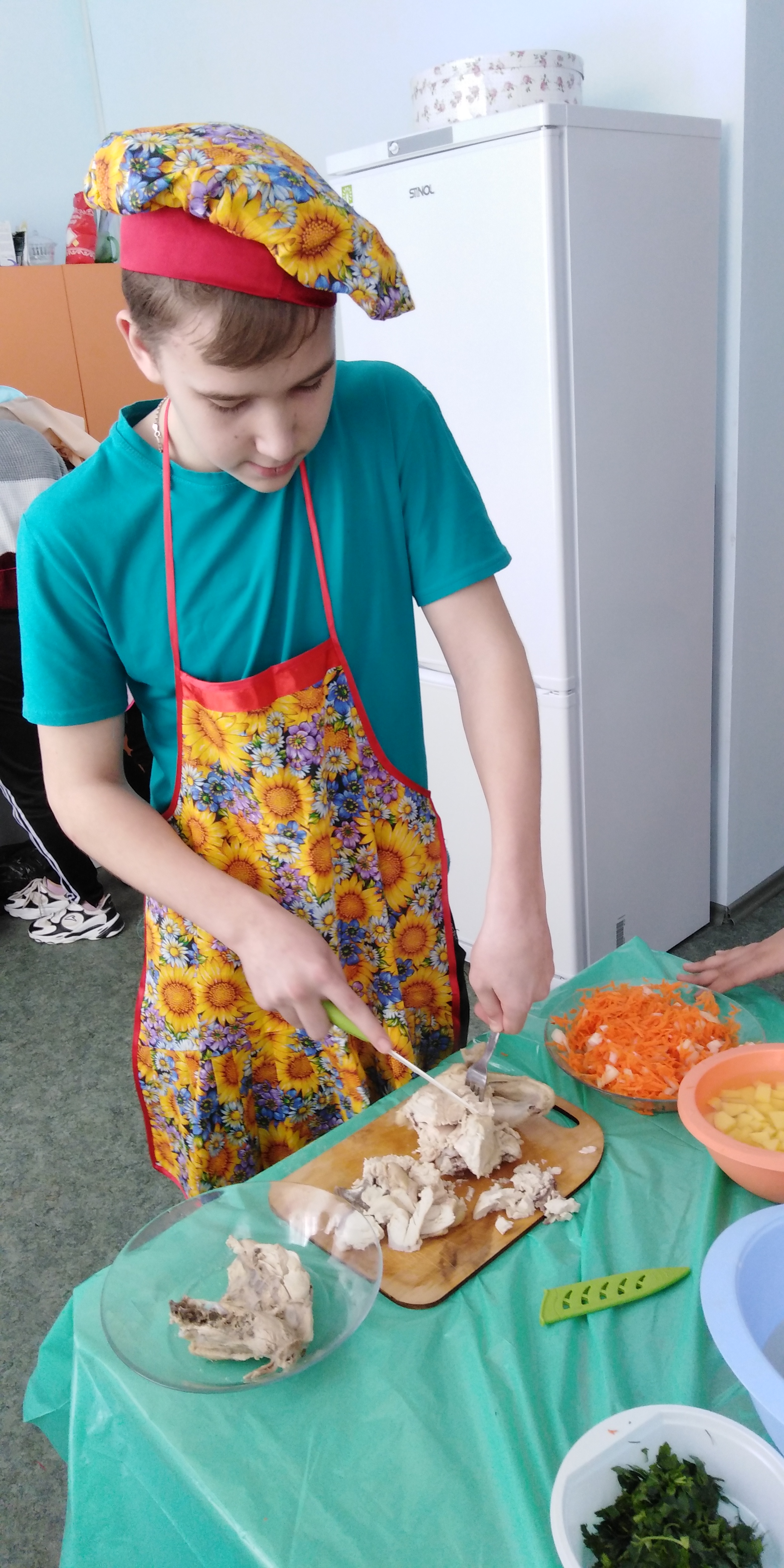 Немного помогала ребятам отделения учебного (тренировочного) сопровождаемого проживания в процессе приготовления, повар, которая объяснила особенности приготовления супа с мясными фрикадельками! Все трудились на отлично: ребята сами резали овощи, зелень, терли на тёрке морковку, катали шарики из фарша (фрикадельки). Блюда у ребят получились на славу! Конечно же, были выбраны победители в номинациях проекта!