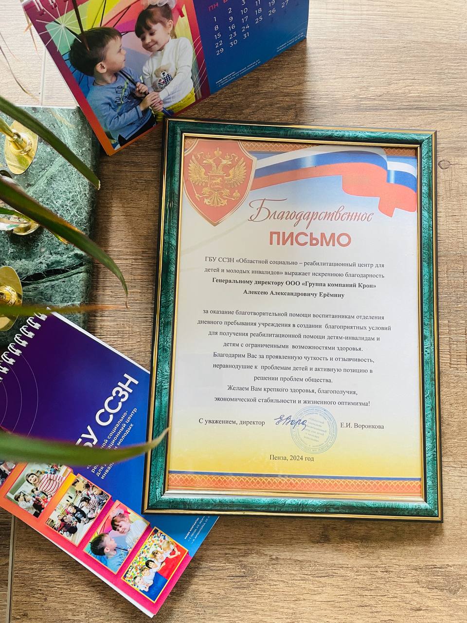Мы выражаем огромные слова благодарности Генеральному директору ООО "Группа компаний Крон" Алексею Александровичу Еремину за оказание благотворительной помощи воспитанникам отделения дневного пребывания учреждения в создании благоприятных условий для получения помощи детям - инвалидам и детям с ограниченными возможностями здоровья. Благодарим Вас за проявленную чуткость и отзывчивость, неравнодушие к проблемам детей и активную позицию в решении проблем общества. Желаем Вам крепкого здоровья, благополучия, экономической стабильности и жизненного оптимизма!