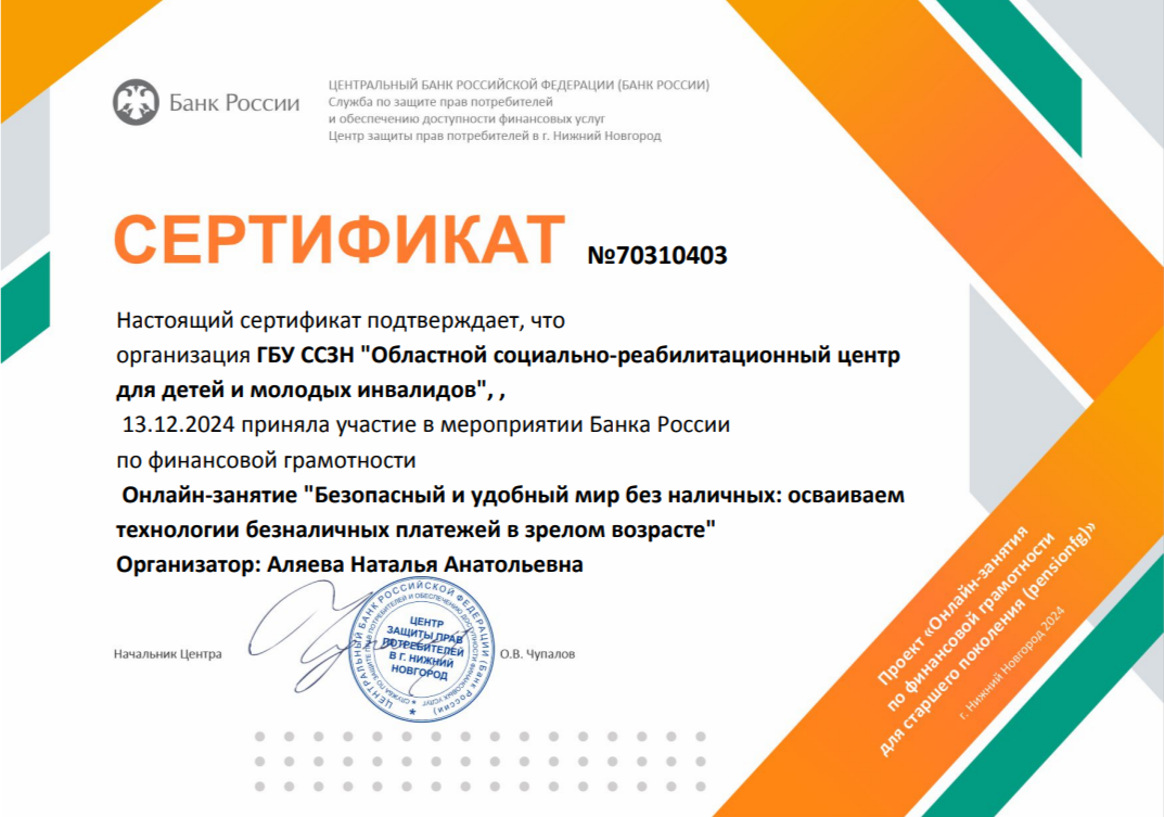 В современном мире очень важно ориентироваться в финансовых вопросах и способах оплаты. 13 декабря резиденты отделения сопровождаемого проживания приняли участие в мероприятии Банка России по финансовой грамотности. В ходе онлайн – занятия "Безопасный и удобный мир без наличных: осваиваем технологии безналичных платежей в зрелом возрасте" ребята освоили быстрый, удобный, а главное безопасный способ осуществления финансовых операций без использования наличных денег. Научились правильно осуществлять платежи по реквизитам с помощью QR-кода и познакомились с системой быстрых платежей (СБП), которая позволяет совершать мгновенные переводы по номеру мобильного телефона в любой банк. По итогам занятия был получен сертификат участника.