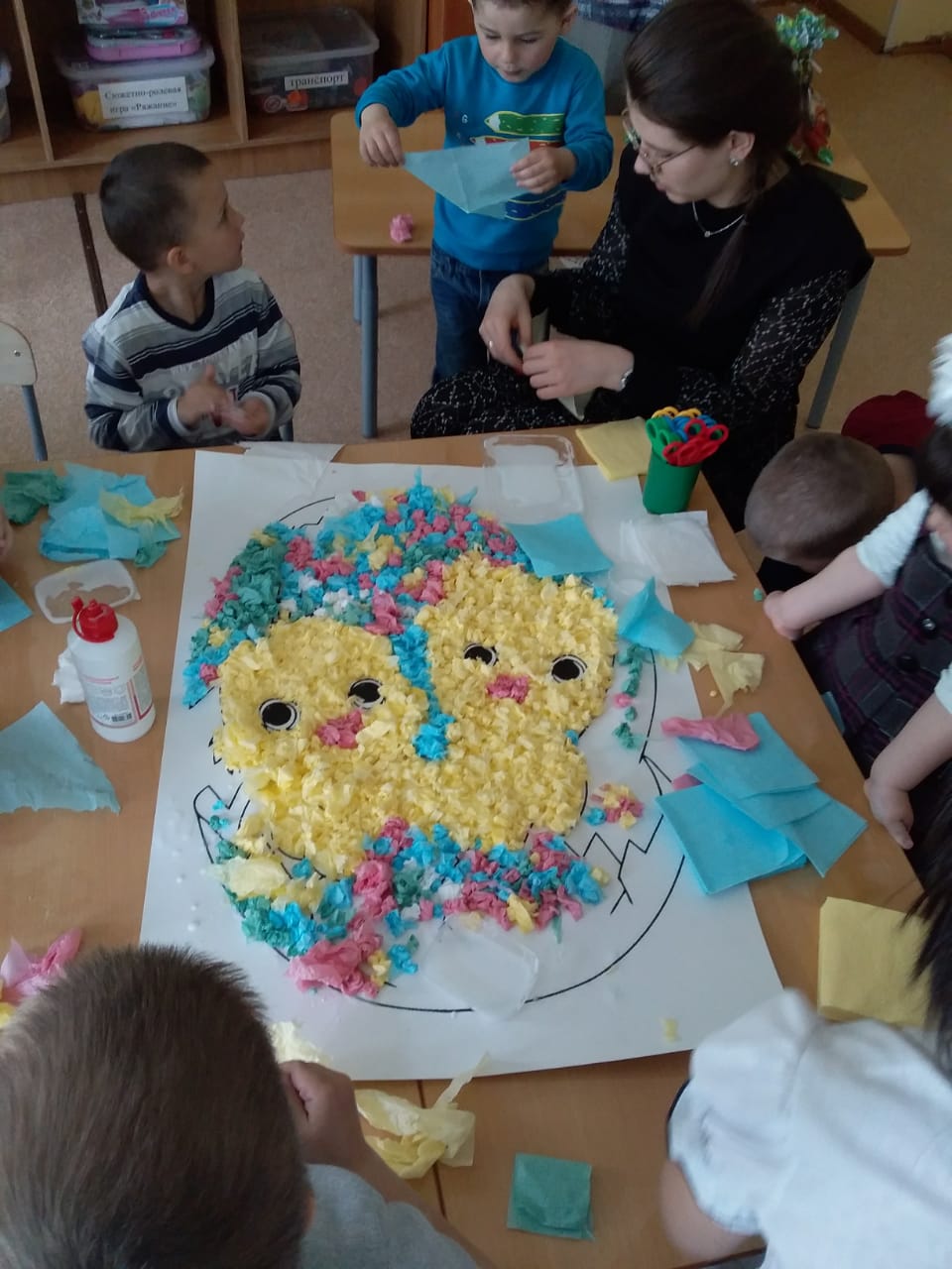 В дошкольной группе прошел мастер класс по изготовлению пасхальной аппликации "Цыпленок" из бумажных салфеток. Дети с увлечением принимали участие и сделали общую композицию.