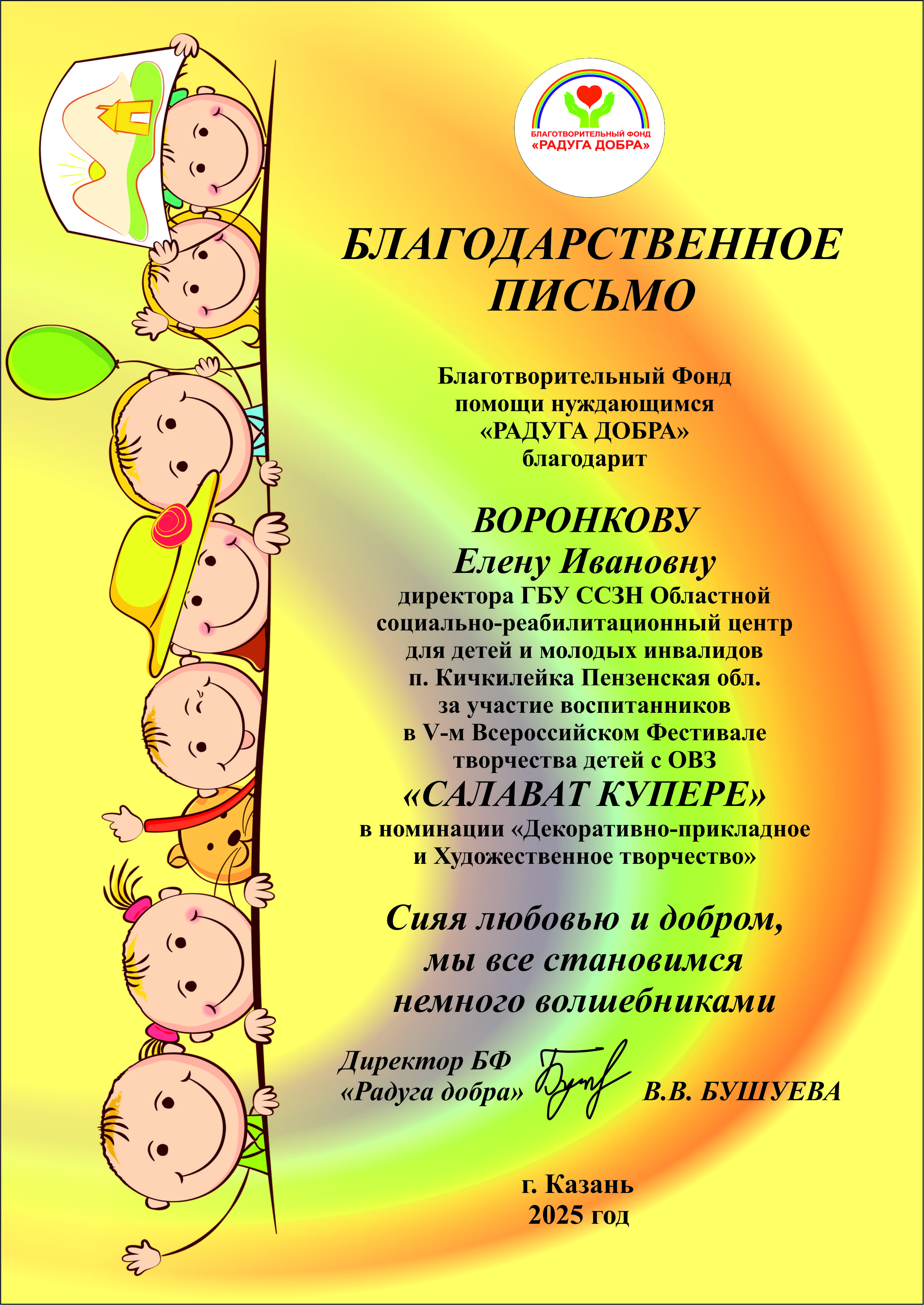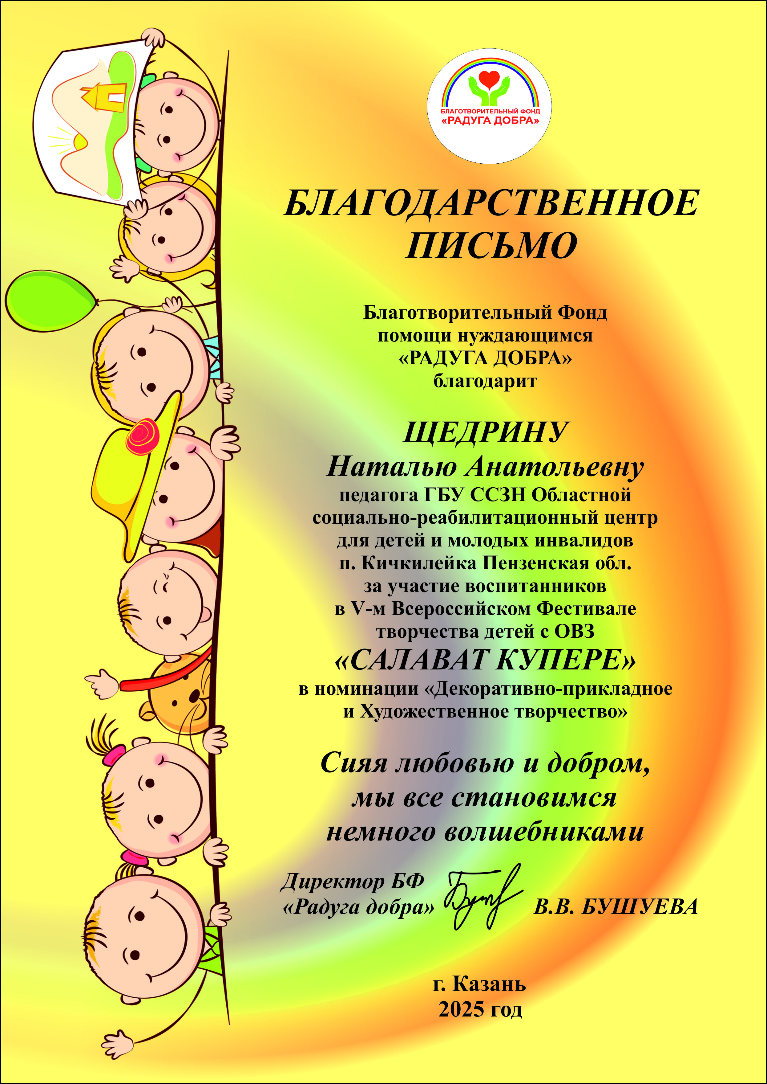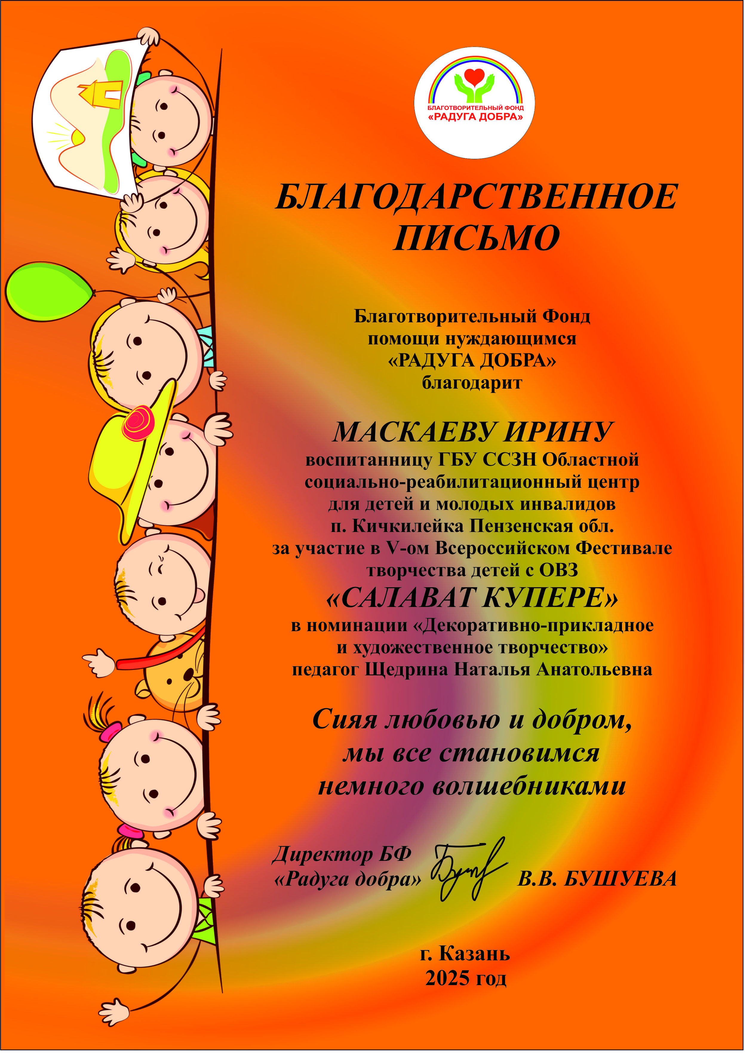 С радостью сообщаем о достижении воспитанницы нашего отделения для детей с особенностями развития Ирины Маскаевой. На V-ом Всероссийском фестивале творчества детей с ограниченными возможностями «САЛАВАТ КУПЕРЕ» она заслуженно стала лауреатом, продемонстрировав свой талант и творческий потенциал. Это событие стало значимым не только для юной участницы, но и для всего нашего коллектива. Жюри фестиваля отметило ее работу, что свидетельствует о высоком уровне подготовки и поддержки, которые она получила в нашем учреждении. В этот знаменательный момент важно отметить и тех, кто стоит за успехом воспитанницы. Директор нашего Центра Елена Ивановна Воронкова и воспитатель Наталья Анатольевна Щедрина были отмечены благодарственными письмами за их непростой труд, внимательность и искреннюю заботу о детях. Их профессионализм и преданность делу создают уютную и поддерживающую атмосферу, в которой каждый ребёнок может раскрепоститься и проявить свои таланты. Пусть это событие станет вдохновением для всех нас продолжать трудиться на благо наших детей, помогать им развиваться и достигать новых высот!