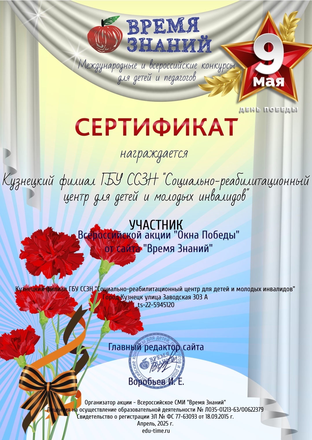 В этом году наша страна отмечает знаменательную дату — 80-летие Великой Победы. Наш реабилитационный центр присоединился к всероссийской акции «Окна Победы». День Победы – это великий и радостный праздник. Мы помним, какой ценой досталась эта победа нашему народу, всех тех, кто погиб, защищая нашу Родину. Участвуя в акции, мы выражаем благодарность героям, храним память о подвиге нашего народа, украшаем окна символами Победы.
