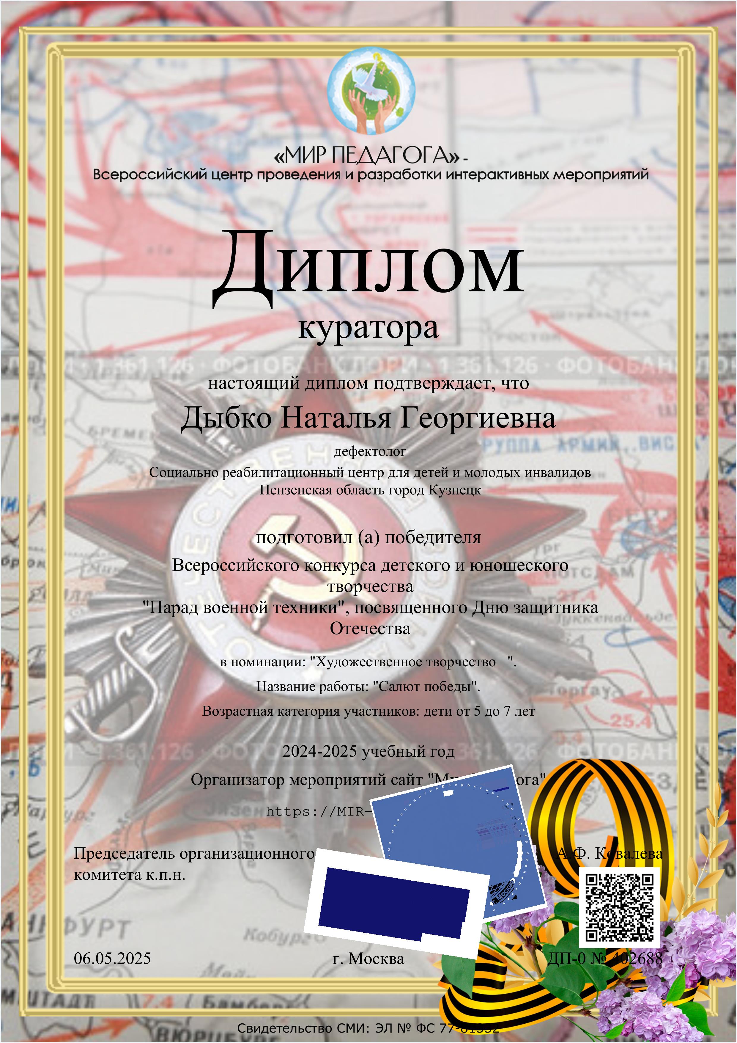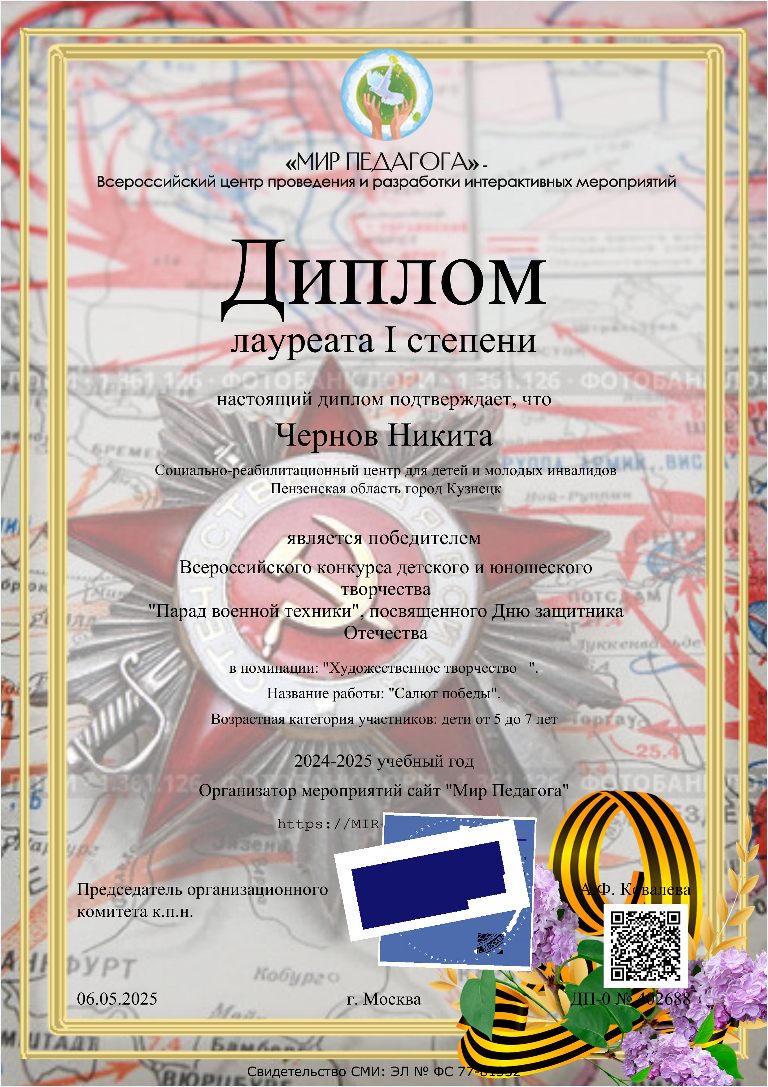 Поздравляем воспитанника Кузнецкого филиала Чернова Никиту с победой во Всероссийском конкурсе детского и юношеского творчества «Парад военной техники» в номинации «Художественное творчество», посвященном Дню защитника Отечества. Никита стал победителем в возрастной категории: дети от 5 до 7 лет. Свою работу он назвал «Салют Победы». Благодарим учителя-дефектолога Дыбко Н.Г. за подготовку участника к конкурсу, а также ребят, которые охотно помогали ему в создании этой работы. Патриотическая тематика является одной из главных в нашем учреждении в дни празднования 80-летия Победы в Великой Отечественной войне. Желаем Никите дальнейших творческих успехов и новых побед!