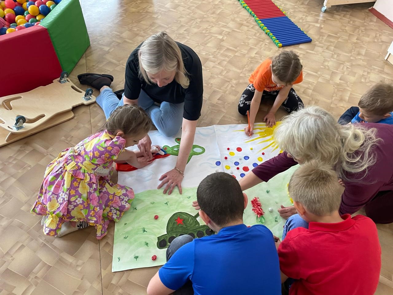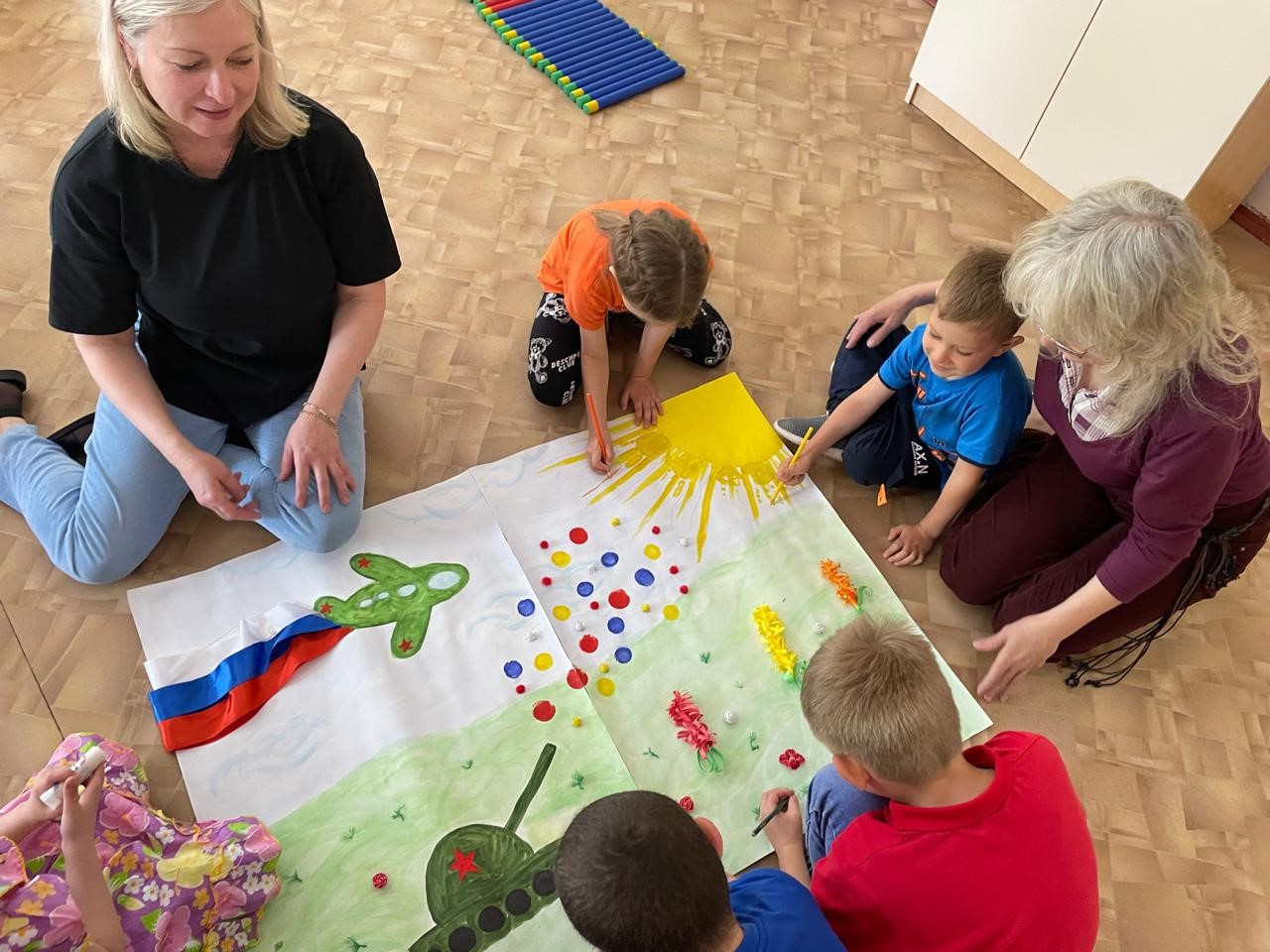 Ребята под руководством учителей-дефектологов Фильевой С.А. и Дыбко Н.Г. приняли участие в подготовке к празднованию 80-летия Великой Победы. Они нарисовали плакат, используя разные нетрадиционные техники рисования: палочками, ватными дисками, кусочками поролона, штампиками. Дети также использовали атласные ленточки для изготовления флага, а цветы сделали из бумаги тишью. Главной идеей создания плаката было желание детей видеть мирное небо над головой, чтобы танки стреляли только цветными шариками, самолеты с ленточками летали над прекрасными цветочными полянами, и светило яркое солнышко. Ангелина Колесова приняла участие в конкурсе «День Победы! Герои, мы не забудем ваш подвиг!» в литературной номинации. На фоне плаката она прочитала стихотворение С. Михалкова «Нет войны». Ангелина стала победительницей среди детей возрастной категории от 5 до 7 лет. Название плаката «Салют Победы» придумал Чернов Никита, он активно принимал участие и высказывал интересные идеи. Поэтому именно его решили представить на конкурс детского художественного творчества, где он стал победителем. Конечно, это заслуга всех ребят.