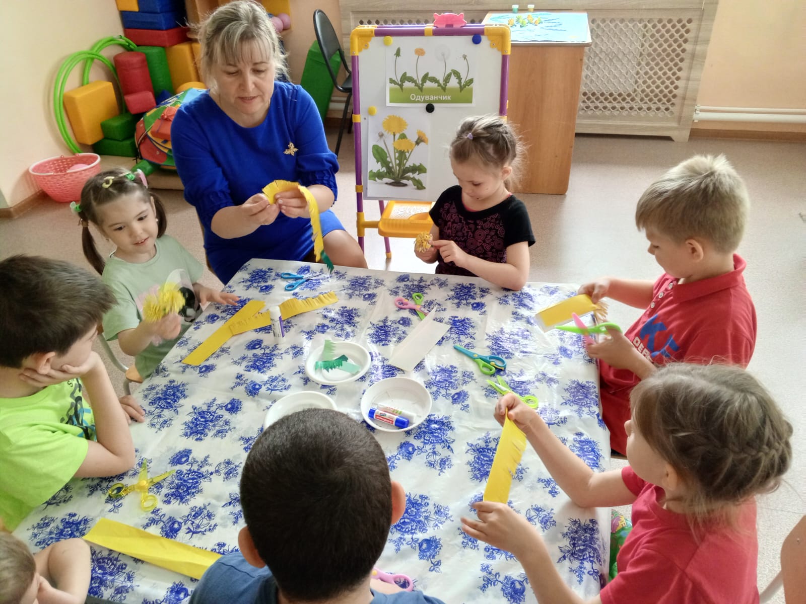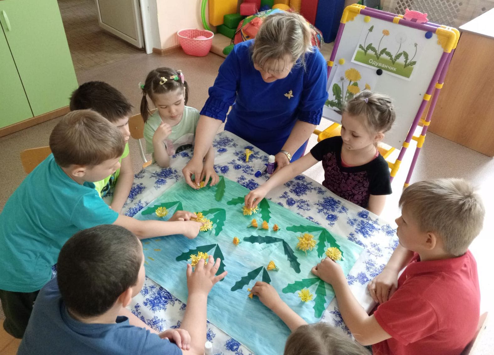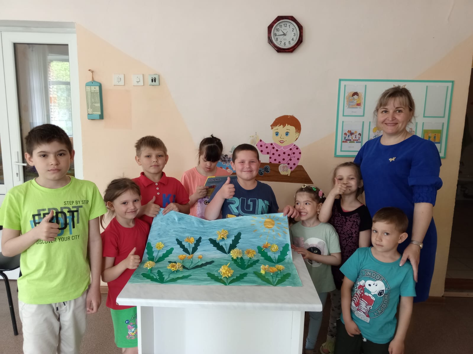 13 мая - Всемирный день одуванчика! Именно веселый желтый одуванчик является одним из символов расцветающей весны. И ребята Кузнецкого филиала в стационарном отделении посвятили свой день этому весеннему цветку. Одуванчик – маленькое солнышко, подаренное нам на радость. Весной этот симпатичный цветок можно встретить на лесных полянах, на лугах, у дорог, возле каждого дома. Одуванчик радует своим весёлым жизнерадостным видом. Ну как за ним не понаблюдать? Ребята рассмотрели строение самого цветка, выделили основные части растения (стебель, листья, цветок), увидели, как он растет и изменяется. Детям этот цветок давно знаком, но о том, что одуванчик является "цветочными часами", узнали только сегодня. Наблюдая за одуванчиком, ребята обратили внимание на то, что утром цветки раскрываются, а поздно вечером и перед дождём — закрываются. Также узнали о целебных свойствах этого растения и о том, как здорово умеют летать семена одуванчика. А красоту цветов выразили в коллективной аппликации "Одуванчиковое поле".