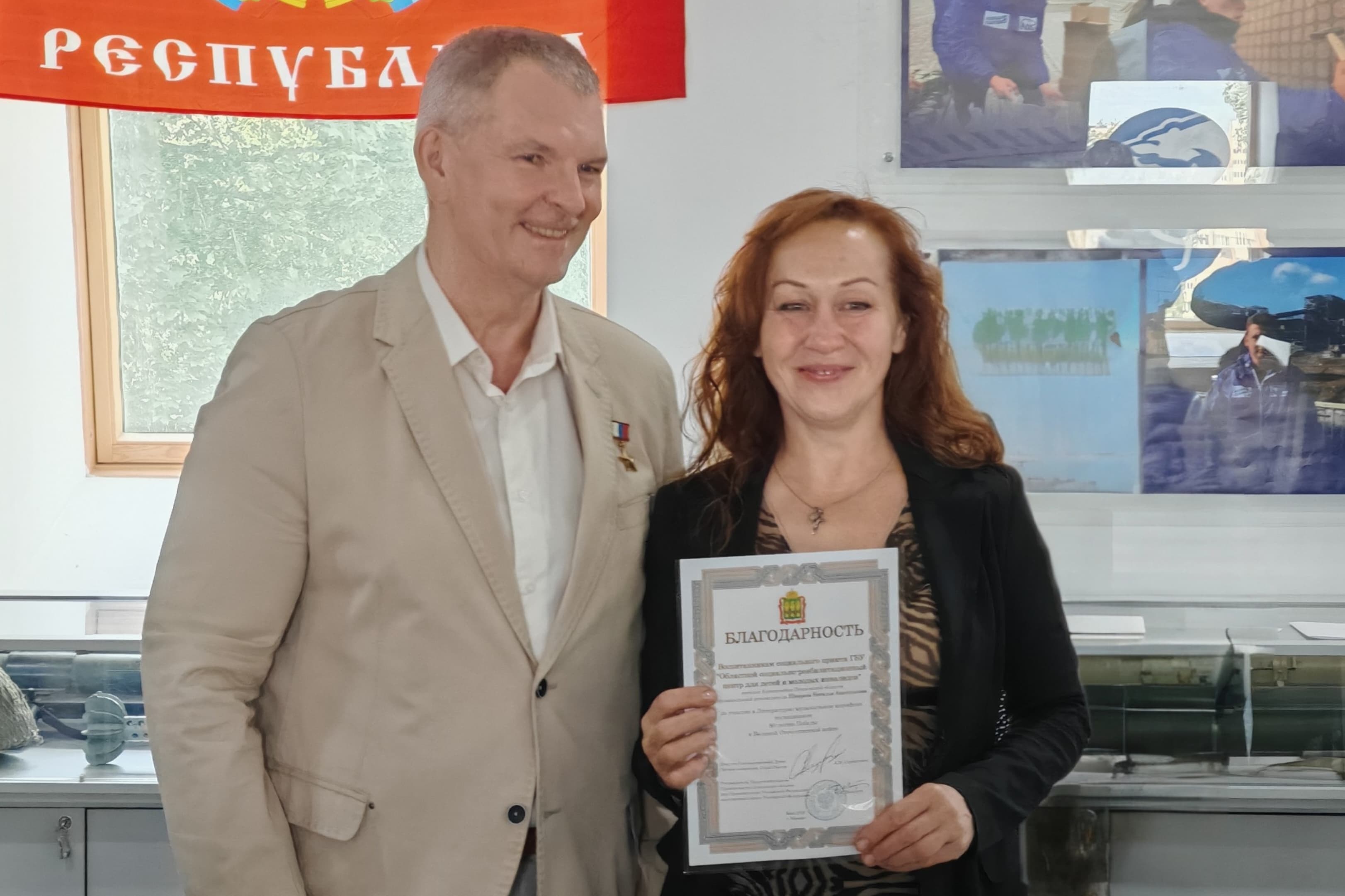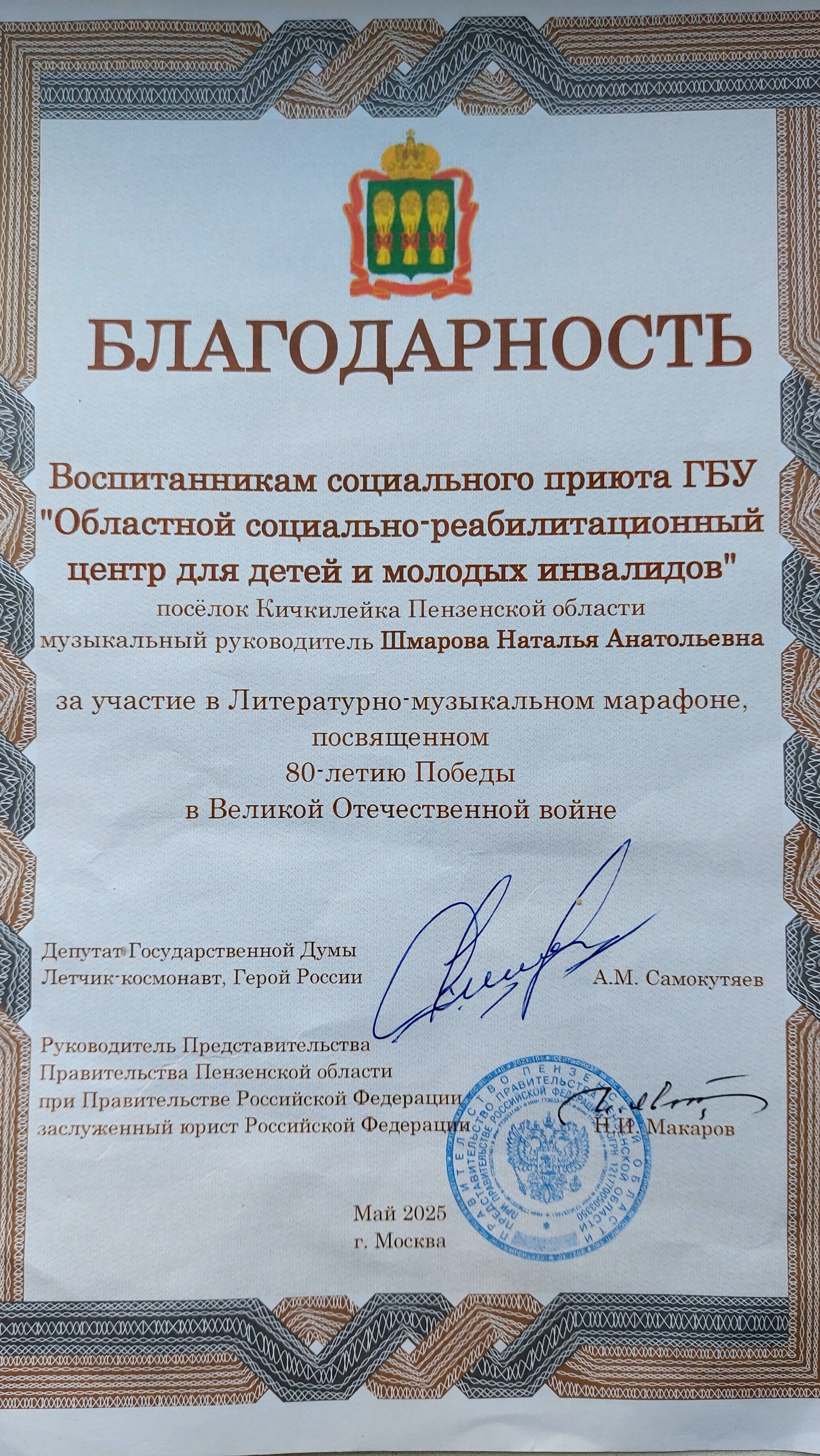 5 июня 2025 г. в здании Регионального отделения Всероссийской политической партии "Единая Россия" состоялась торжественная церемония награждения участников литературно-музыкального марафона, посвященного 80-летию Победы в Великой Отечественной войне, организованного Представительством Правительства Пензенской области в Москве. За исполнение знаменитой песни "Катюша" Благодарностью были отмечены музыкальный руководитель Шмарова Наталья Анатольевна и воспитанники отделения сооциального приюта ГБУ ССЗН "Областной социально-реабилитационный центр для детей и молодых инвалидов": Кашкин Даниил, Симонова Ольга, Ежова Ульяна, Кочнева Милена. Благодарности участникам акции-марафона вручал Депутат Государственной Думы, летчик-космонавт, Герой России Александр Михайлович Самокутяев. Также Благодарственное письмо получено от Представительства Правительства Пензенской области при Правительстве Российской Федерации.