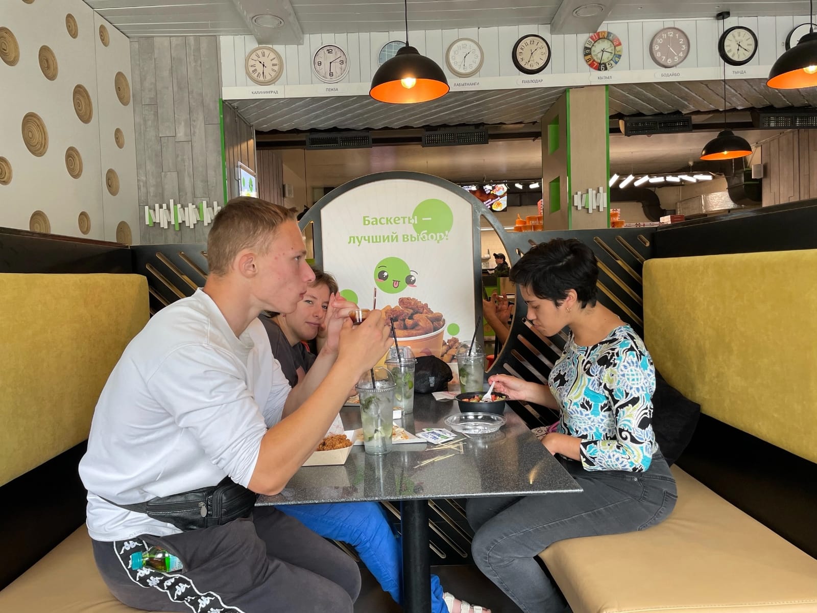 За окном льёт дождь, значит, самое время вспомнить прогулку в солнечный денёк по улице Московской. Началась она с качелей у фонтана, затем резиденты отделения сопровождаемого проживания отправились на пешеходную экскурсию по центральной улице города. Вспомнив историю, ребята заглянули в магазин хобби, где показали свои навыки социально-средовой ориентации: выбирая товары, узнавая интересующую их информацию у консультантов и оплачивая свои покупки на кассе. И как же без посещения кафе, в котором самая вкусная еда, ведь заказ каждый делал самостоятельно.