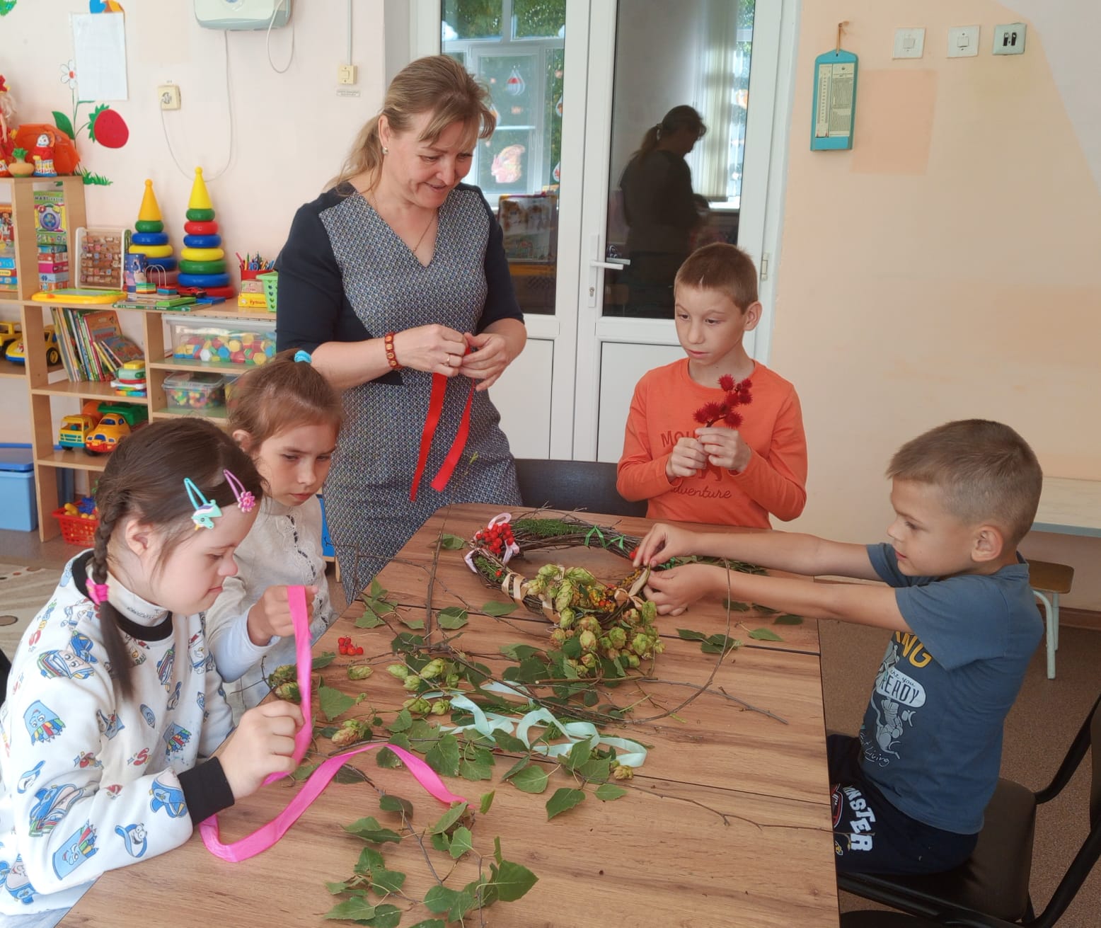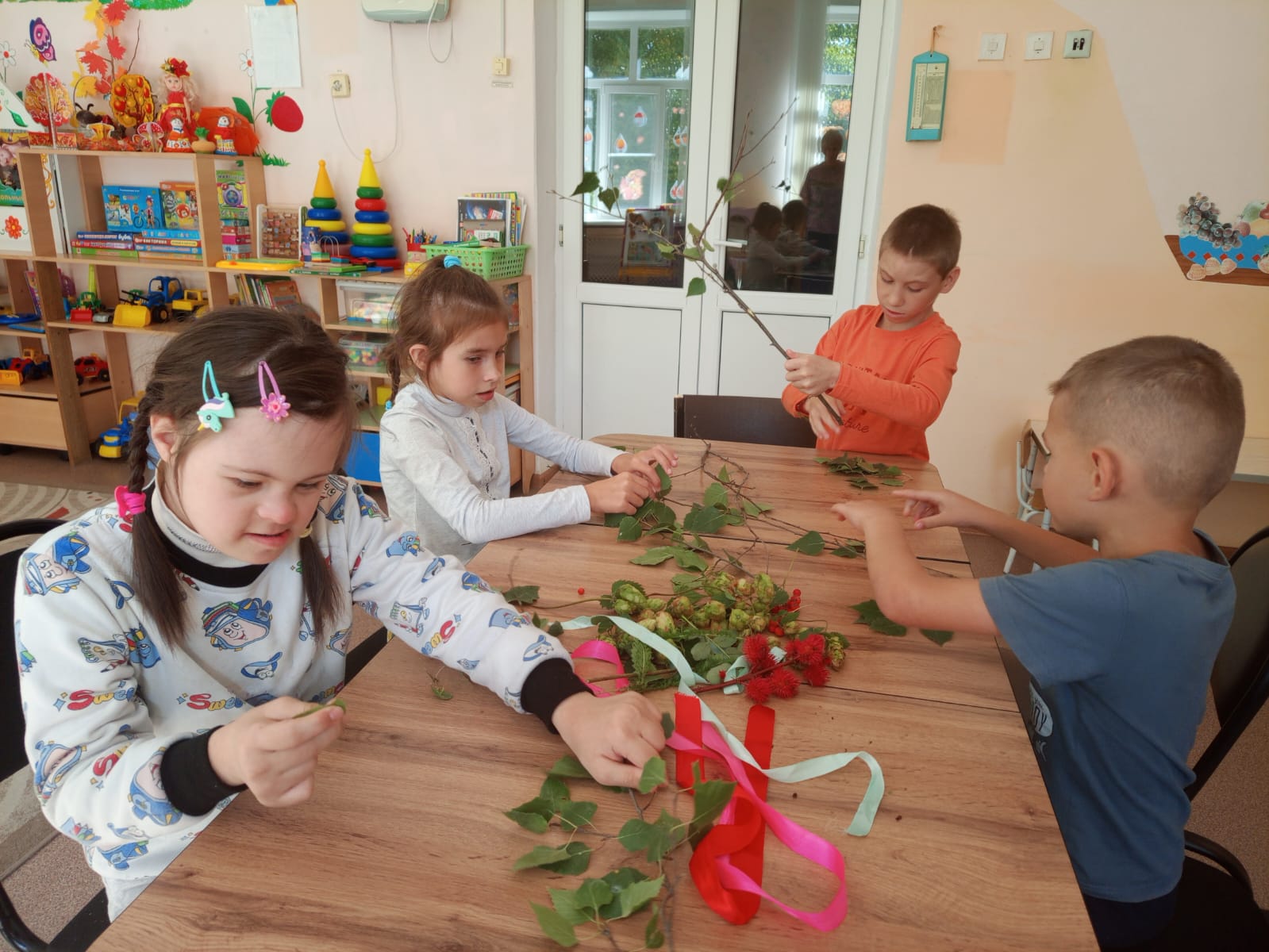 Осень – прекрасное время года. Сколько ярких и сочных красок вокруг! На земле ярким ковром лежат жёлто-красные листья. От дерева к дереву тянутся тонкие серебристые нити лёгкой паутинки. Хочется подольше задержать это прекрасное время года. Воспитанникам Кузнецкого филиала захотелось хотя бы на время сохранить красоту осени. А так как в сентябре отмечается день осеннего венка, дети вместе с воспитателем Тороповой Еленой Юрьевной решили смастерить осенний венок! На прогулке собрали веточки берёзы, ягодки рябины, шишки, листочки. Из осенних ярких красок венок будет радовать нас целую осень!