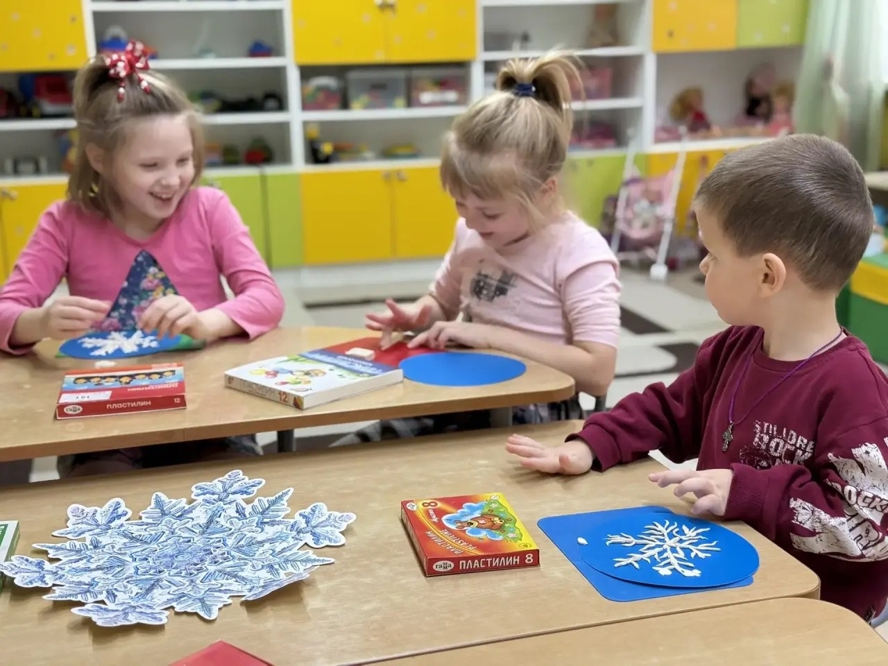 Ребята отделения социального приюта делали снежинки из пластилина. Предварительно с детьми на улице рассмотрели снежинки, считали, сколько у них лучиков. Каждый составил свой узор. Вот такие снежинки у нас получились.