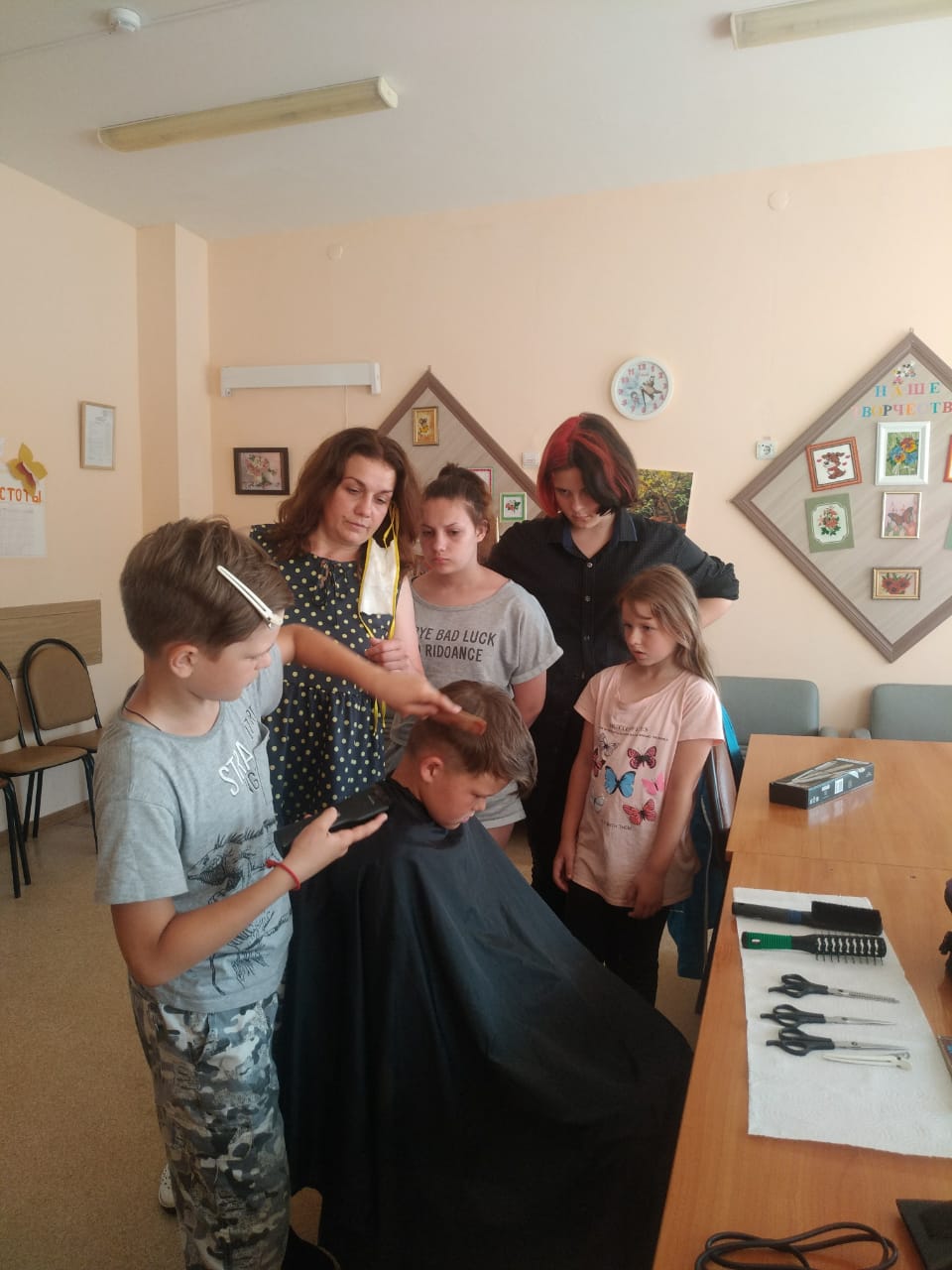10.07.2021, в рамках организации досуга, в отделении социального приюта воспитателем Бакаевой С.С. проведено занятие кружка "Красота и стиль". Задача кружка: поэтапно знакомить и развивать интерес к искусству причёсок, развивать творческую фантазию, положительный настрой, воспитывать трудолюбие и аккуратность, хороший вкус. Занятия способствуют профориентации учащихся. Сначала воспитатель провел инструктаж по техники безопасности. Потом ребята познакомились с азами моделирования причёсок и приобрели навыки пользования инструментом. Кружок очень заинтересовал ребят. Они ждут новых занятий.