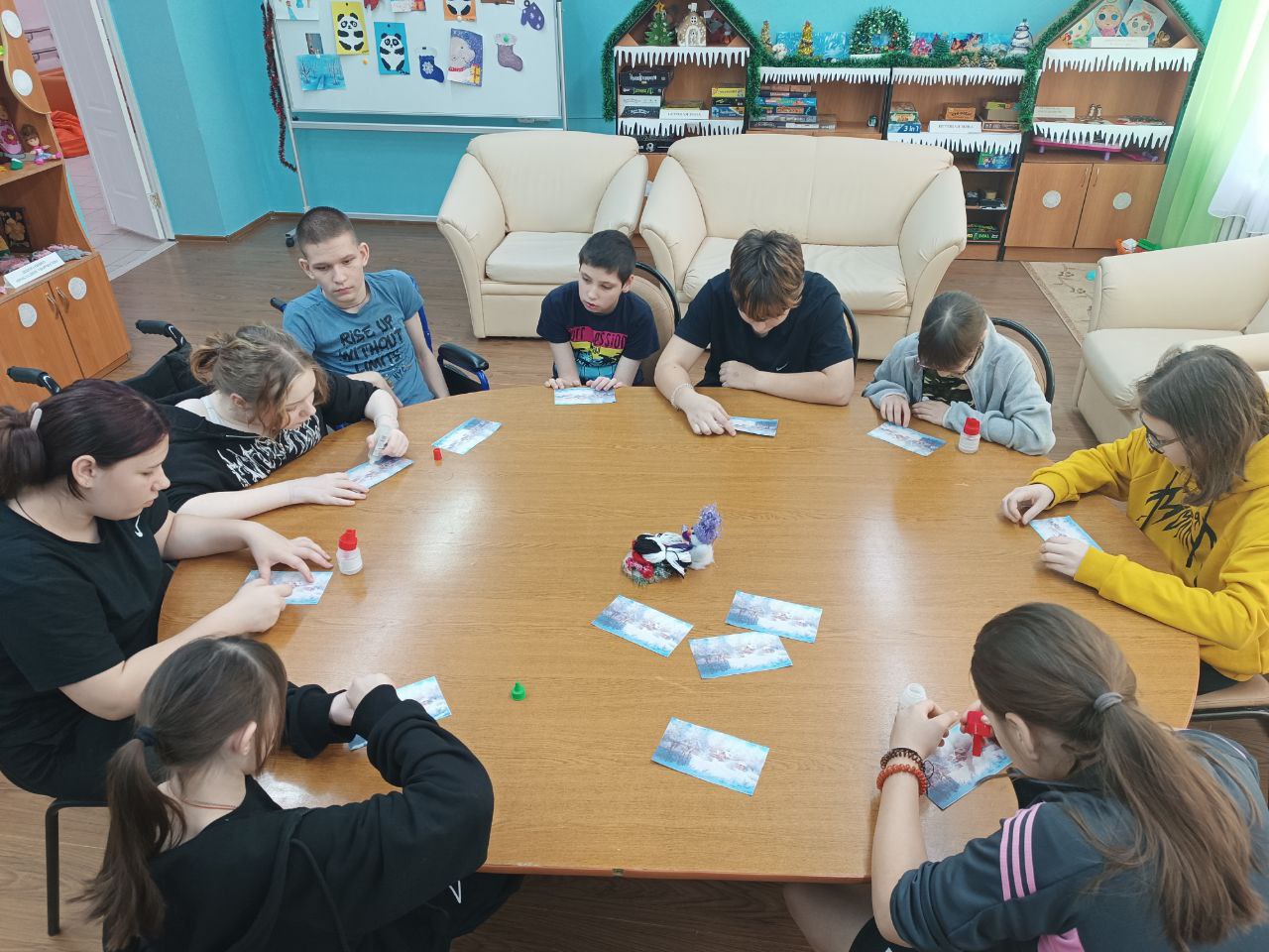Русская зима щедро одаривает нас пейзажами невероятной красоты. Белоснежная, пронзительная чистота и великолепие сопровождают жителей России все зимние месяцы, особенно радуя и волнуя детей. Мы все с нетерпением ждем первого снега и встречаем его с неподдельной детской радостью. Как приятно любоваться из окна заснеженными деревьями, синичками и снегирями на ветках! А бескрайние снежные просторы России всегда были и остаются неиссякаемым источником вдохновения для русских художников. Как же искрится снег на солнце! Он переливается тысячами алмазных граней, сверкает бриллиантовой россыпью на крышах, деревьях, полях. Именно такой морозный, искрящийся день воссоздали в своих работах воспитанники отделения для детей с особенностями развития, используя клей и голографические блестки.