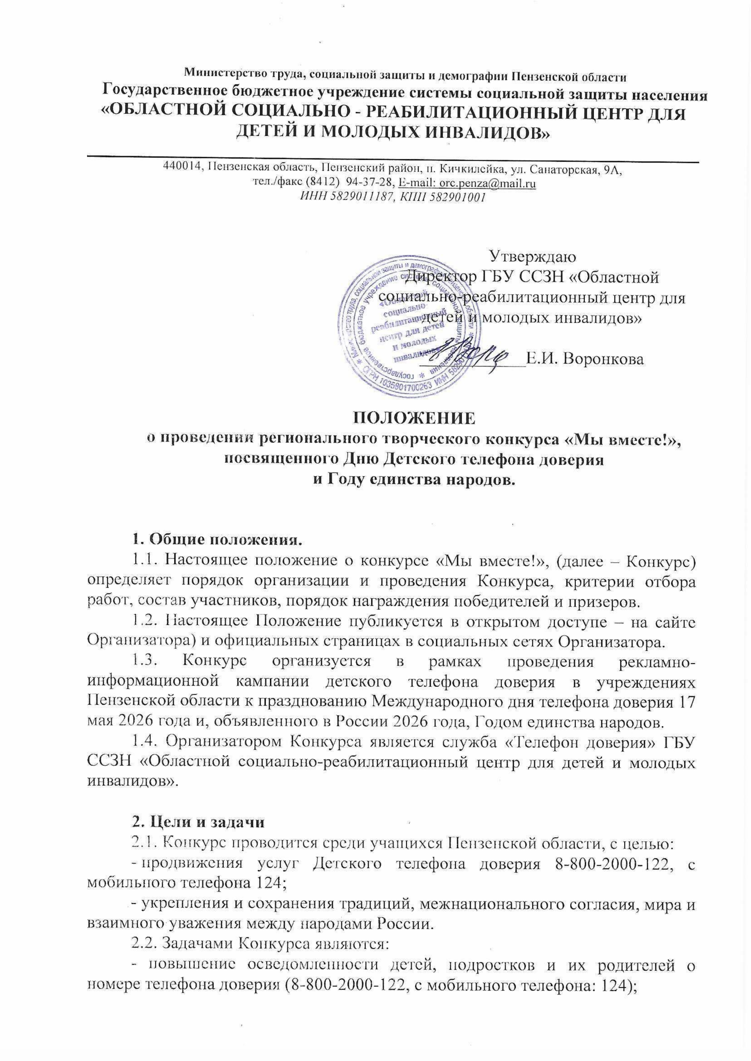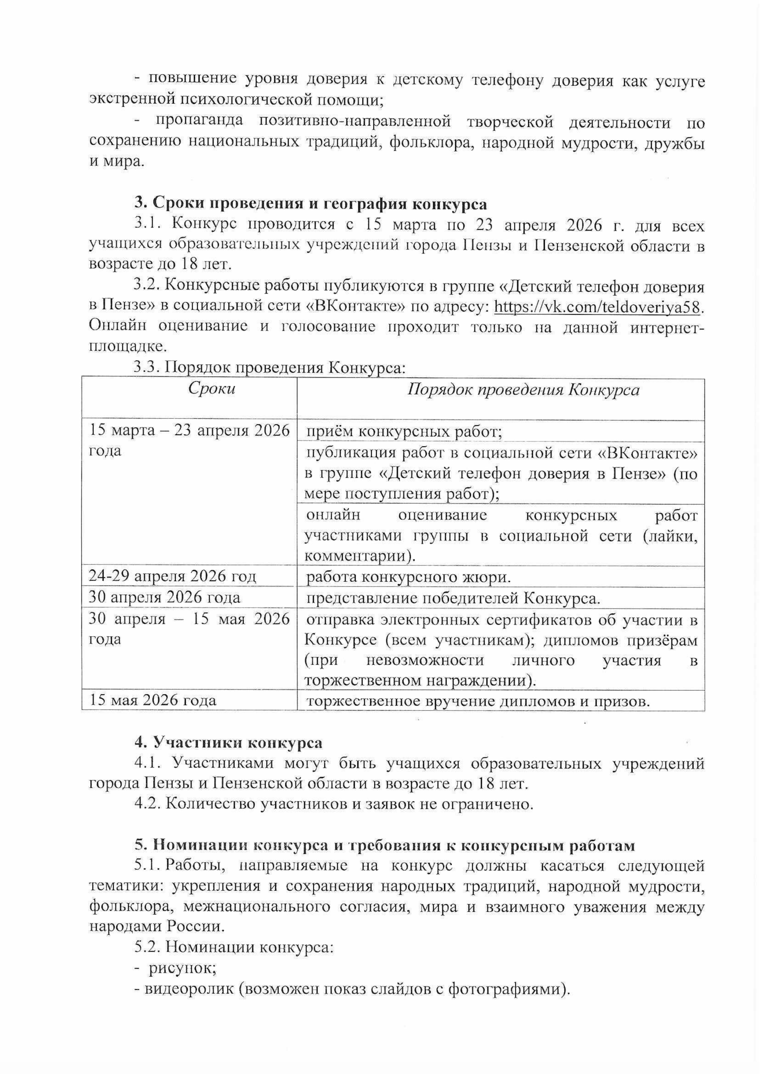 Детский телефон доверия в Пензе объявляет о старте Регионального творческого конкурса «Мы вместе!», посвященного Дню Детского телефона доверия и Году единства народов, объявленному в России в 2026 году. Укрепление и сохранение традиций, межнационального согласия, мира и взаимного уважения между народами России – это ВАЖНО! Давайте же окунемся в творчество!!! Участниками конкурса могут быть учащиеся образовательных учреждений города Пензы и Пензенской области в возрасте до 18 лет. Что нужно сделать? Нарисовать рисунок или создать видеоролик (возможен показ слайдов с фотографиями) по темам: укрепление и сохранение народных традиций, народной мудрости, фольклора, межнационального согласия, мира, дружбы и взаимного уважения между народами России. Подробные правила оформления работ, критерии оценки, хронометраж видео роликов, условия дисквалификации участников и др. уточняйте в Положении о конкурсе и его приложениях, прикрепленных к настоящему посту. Конкурсные работы будут приниматься с 15.03.2026 г. до 23.04.2026 г. включительно по электронной почте konkurs.dtd@mail.ru . Информация о ходе конкурса, его итогах и победителях будет размещена в социальной сети по адресу: https://vk.com/teldoveriya58.