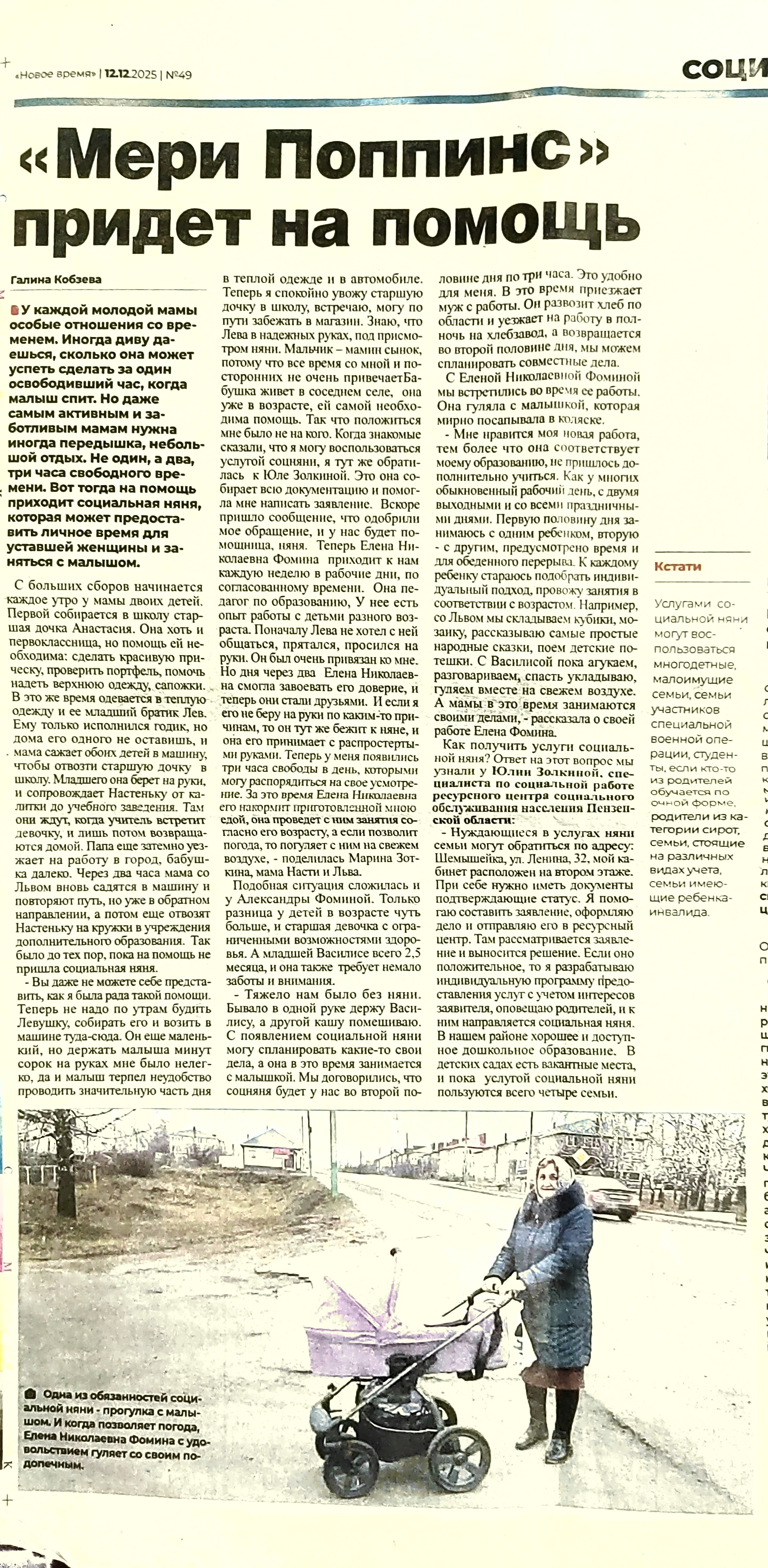 Продолжаем листать подшивки пензенских газет в поисках добрых историй. Сегодня наш герой — Елена Николаевна Фомина, «социальная няня» из Шемышейского района, которая сумела найти ключик к сердцу даже самого застенчивого малыша. О том, как в районе работает проект «Социальная няня», рассказывает газета «Новое время», выпуск № 49. Для семей появление Елены Николаевны стало настоящим спасением. Вот как описывает свои будни одна из мам, Марина Зоткина: «Вы даже не можете себе представить, как я была рада такой помощи». В семье Александры Фоминой ситуация требует еще большего внимания: старшая дочка имеет ограниченные возможности здоровья, а младшей Василисе всего 2,5 месяца. «Тяжело нам было без няни. Бывало, в одной руке держу Василису, а другой кашу помешиваю. С появлением социальной няни могу спланировать свои дела», — делится мама. Сама Елена Фомина признается, что работа приносит ей удовольствие, тем более что она полностью соответствует образованию. «К каждому ребенку стараюсь подобрать индивидуальный подход. Со Львом мы складываем кубики, рассказываю простые народные сказки, поем потешки. С Василисой пока агукаем, разговариваем, спать укладываю», — рассказала о своей работе Елена. Услуга «социальная няня» доступна во всех районах области и продолжает расширяться, чтобы каждая семья, оказавшаяся в сложной ситуации, могла рассчитывать на профессиональную заботу и внимание.