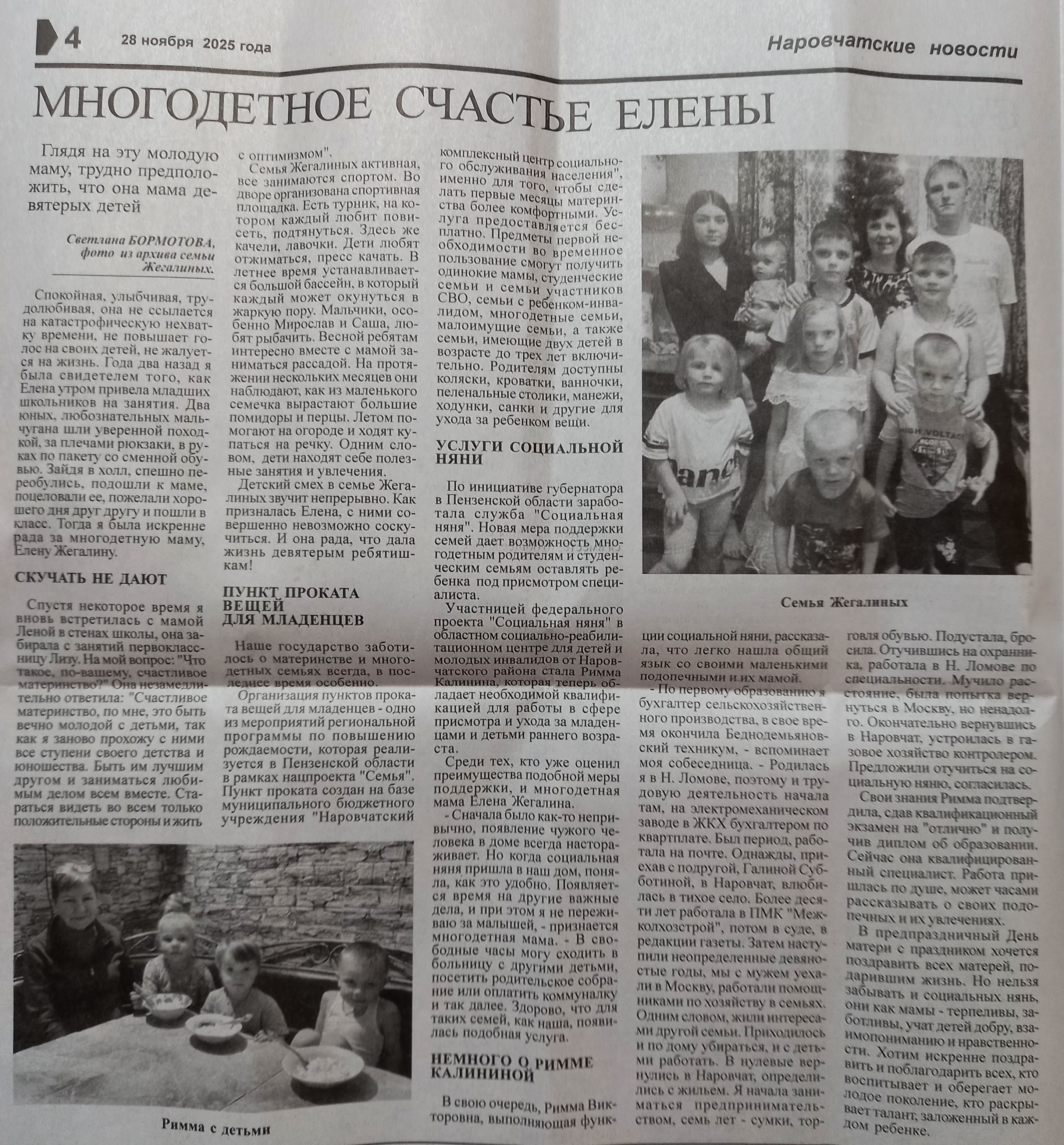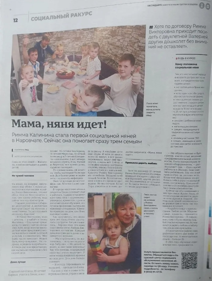 Продолжаем читать и смотреть, что пишут газеты Пензенской области о наших «социальных нянях». Сегодня в центре внимания сразу два издания: «Наровчатские новости» (№ 10 от 28 ноября 2025 года) и «Пензенская правда» (№ 5 от 04 февраля 2026 года). Оба рассказали историю Риммы Викторовны Калининой — «социальной няни» в Наровчатском районе. «Мама, няня идет!» — с этим радостным криком двухлетняя Лера встречает Римму Викторовну. Для многодетной мамы Елены Жегалиной, воспитывающей девять детей, «социальная няня» стала настоящим спасением, а для всей большой семьи — родным человеком. Римма Викторовна помогает сразу нескольким семьям. И в каждом доме её ждут с нетерпением. «А теперь уже и не представляю, как мы раньше справлялись без нашей няни», — делится Елена Жегалина. Сама Римма Викторовна признаётся: «На работу я иду с удовольствием. Люблю детей. Общение с ними — в радость». Подробнее — можно прочитать в статьях. Но главное и так видно: спокойствие родителей и счастливые глаза детей. Ради этого мы и работаем.