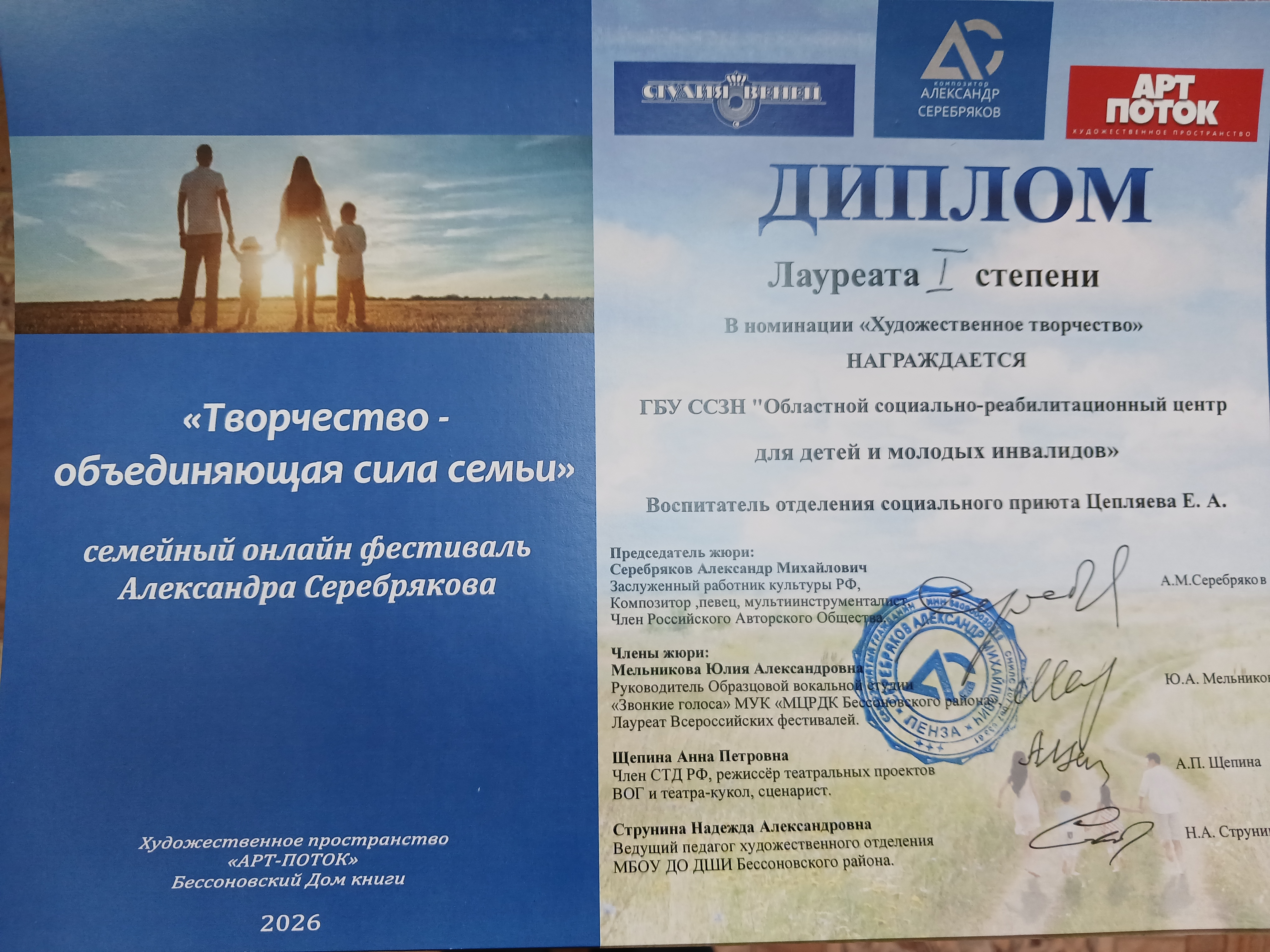 В субботу, 25 апреля, в АРТ-ПОТОКЕ "Дом книги" с. Бессоновка с большим успехом прошел семейный фестиваль "Творчество-объединяющая сила семьи". Инициатором и организатором стал Заслуженный работник культуры Российской Федерации, певец и композитор Александр Михайлович Серебряков. Мероприятие прошло в рамках празднования Международного Дня семьи. В отборочном туре, который проходил онлайн, приняли участие творческие семьи из Москвы, Сердобска, Пензы и Пензенской области. Среди участников фестиваля был наш педагог отделения социального приюта со своими воспитанниками. Был вручен Диплом Лауреата 1 степени. Это яркое и душевное мероприятие объединило детей и родителей, продемонстрировав, как совместное творчество укрепляет семейные связи и раскрывает таланты поколений. Ведь семья - основа общества, хранительница памяти и главный источник любви к родной культуре.
