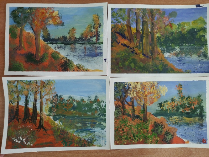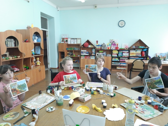Золотая осень своими красками и атмосферой вдохновляла на творчество поэтов, писателей и художников многие века. Вот и ребята из отделения для детей с физическими недостатками, в рамках кружка «Разбуди в себе художника», раскрашивают осенние листья так, как им видится. Осваивают осенний пейзаж. Занятия рисованием способствуют самовыражению детей, а также выполняют коррекционные функции. Например, при написании пейзажа ребятам пришлось выполнять многоступенчатые инструкции при смешивании цвета. Сначала они запутались, так как не сразу получилось. Но смогли сосредоточиться и в результате своими работами дети остались довольны.
