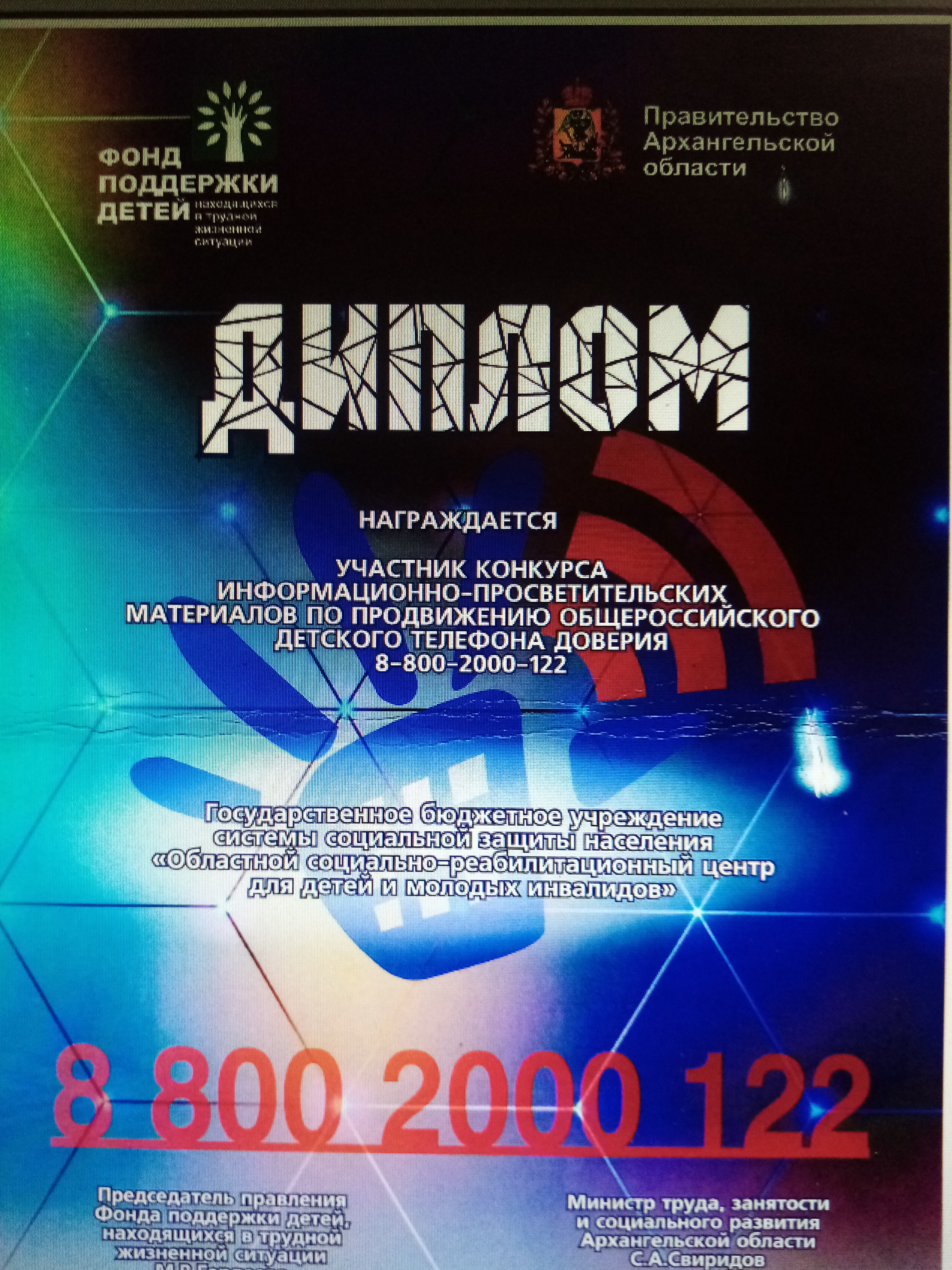 Сотрудники ГБУ ССЗН "Областной социально - реабилитационный центр для детей и молодых инвалидов" награждены дипломом участника конкурса информационно – просветительских материалов по продвижению общероссийского детского телефона доверия 8-800-2000-122. Психологи Детского телефона доверия приняли активное участие в таких номинациях, как "Лучший информационно-просветительский материал для родителей", где были представлены буклеты "Детский телефон доверия - что можно доверить?" и "Мы рядом!". В номинации "Лучший интерактивный просветительский продукт" разработан классный час по теме: "Сочиняем и рисуем сказки о верном и надежном помощнике – Детском телефоне доверия".