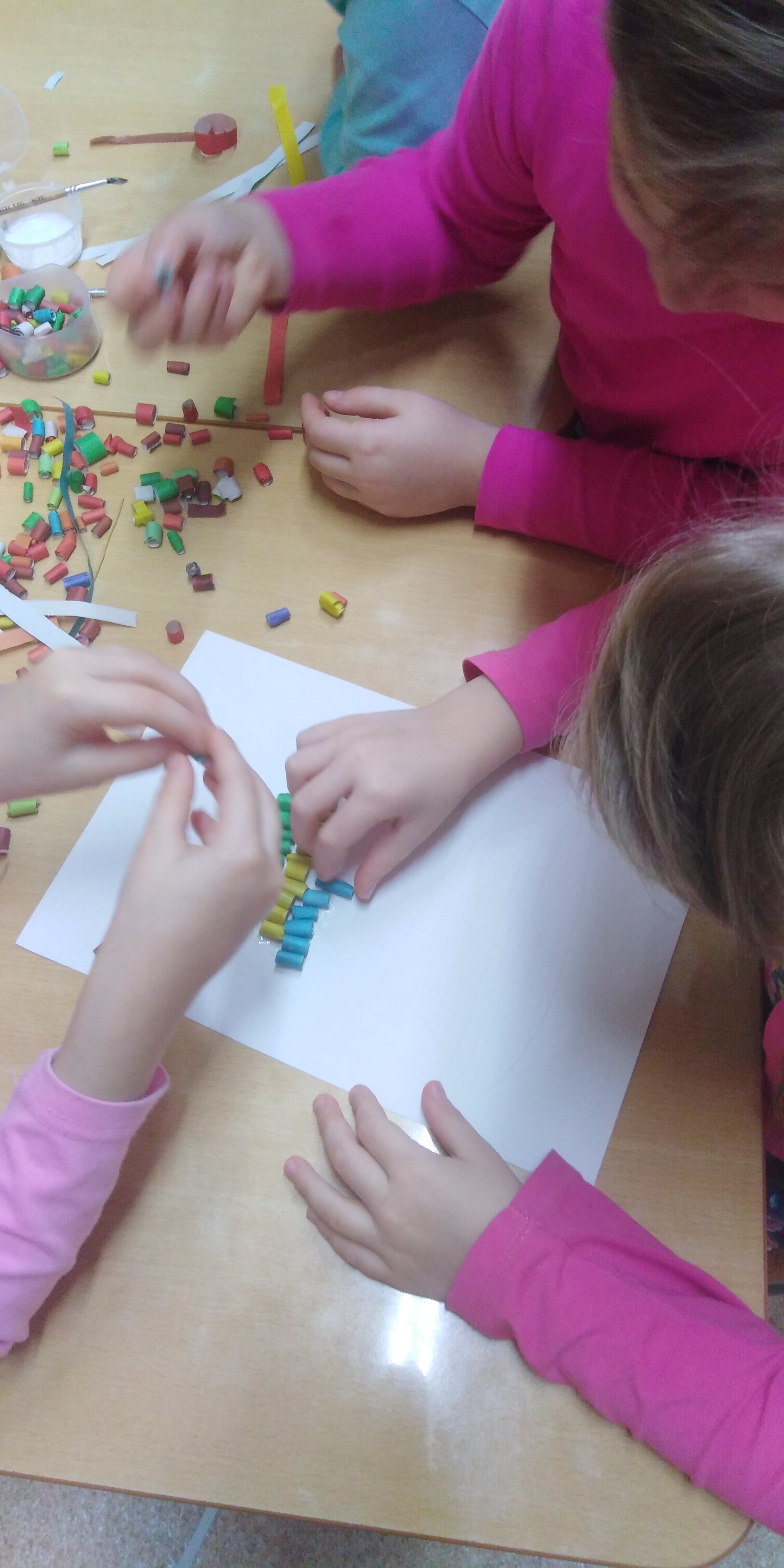 Квиллинг - это искусство бумагокручения, то есть изготовление плоских или объёмных композиций из скрученных в спирали длинных узких полос бумаги. Готовым спиралям придается различная форма. Так получаются модули, из которых создаются работы: картина, открытки. Искусство бумагокручения возникло в конце 14 века в Западной Европе. Считается, что квиллинг придумали монахи, обрезая позолоченные края книг, они накручивали их на кончики птичьих перьев, отсюда название, что означает птичье перо, таким образом создавали имитацию золотой миниатюры. И уже из подготовленных деталей собирали картину, чередуя между собой разные цвета. Детишки с большим интересом взялись за дело. В процессе работы ребята помогали друг другу, давали советы, как лучше и удобнее скручивать полоски. Когда заготовки были готовы, ребята стали создавать ёлочку. Так получилась наша чудо- ёлочка. Ребята с интересом и с большим восхищением рассматривали своё творение.