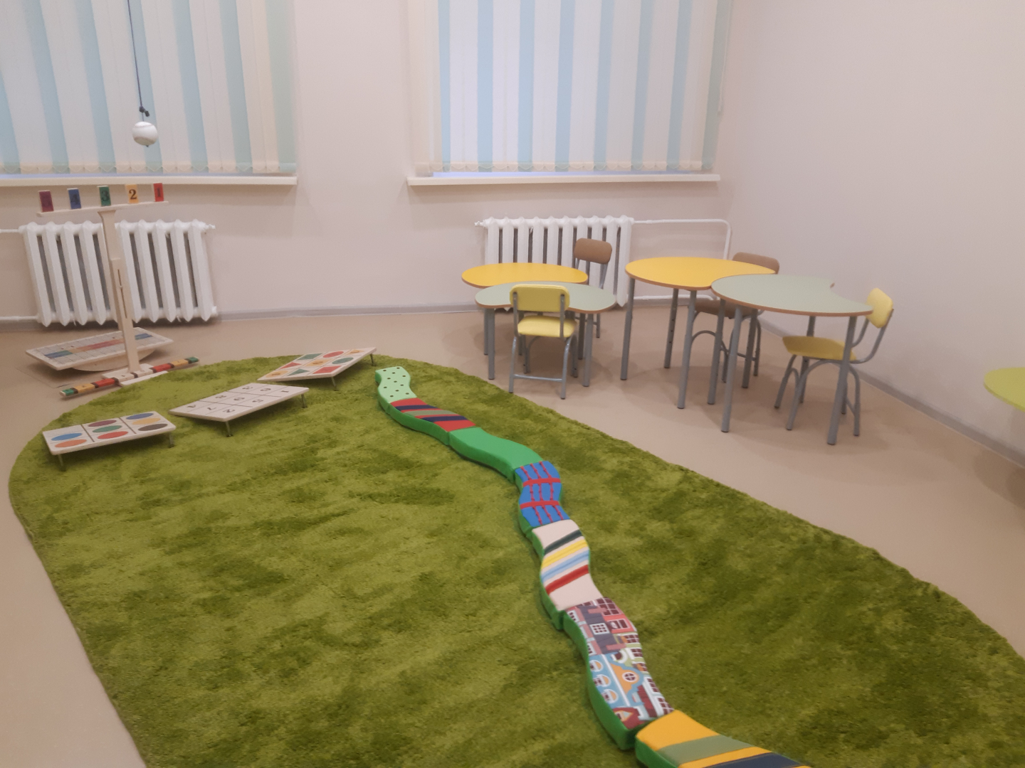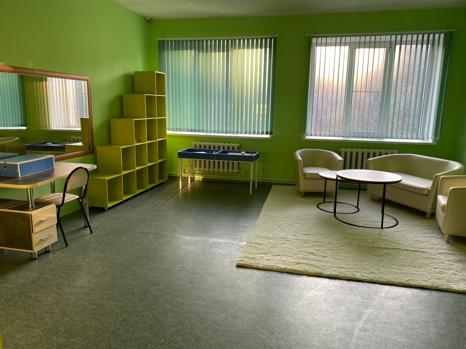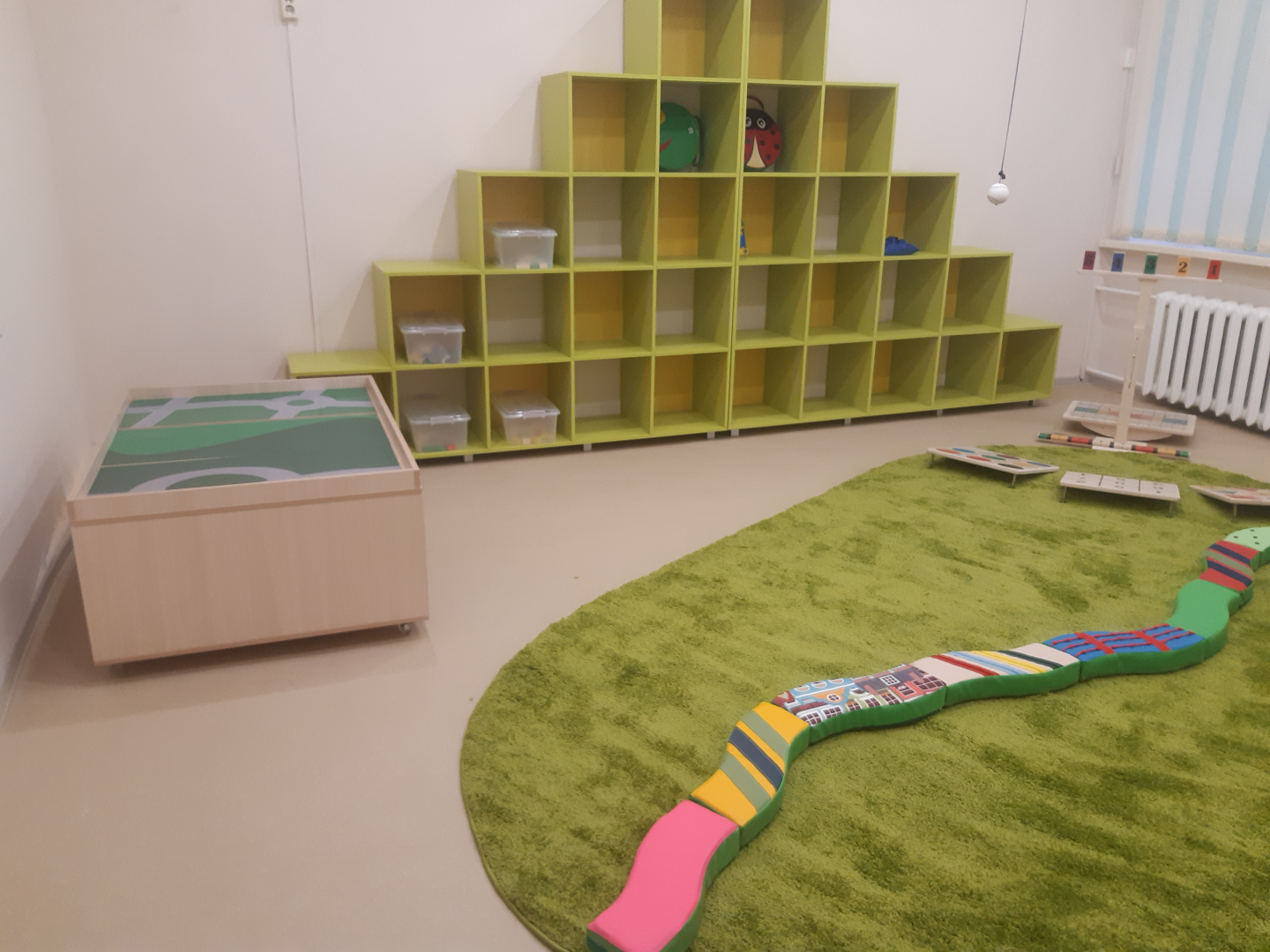 - зона для проведения психологической реабилитации для детей младшего возраста, где организовано игровое пространство и пространство для творчества, что позволяет проработать на уровне эмоций психотравмирующую ситуацию, а также путем проигрывания различных ситуаций сформировать навыки адаптивного поведения;