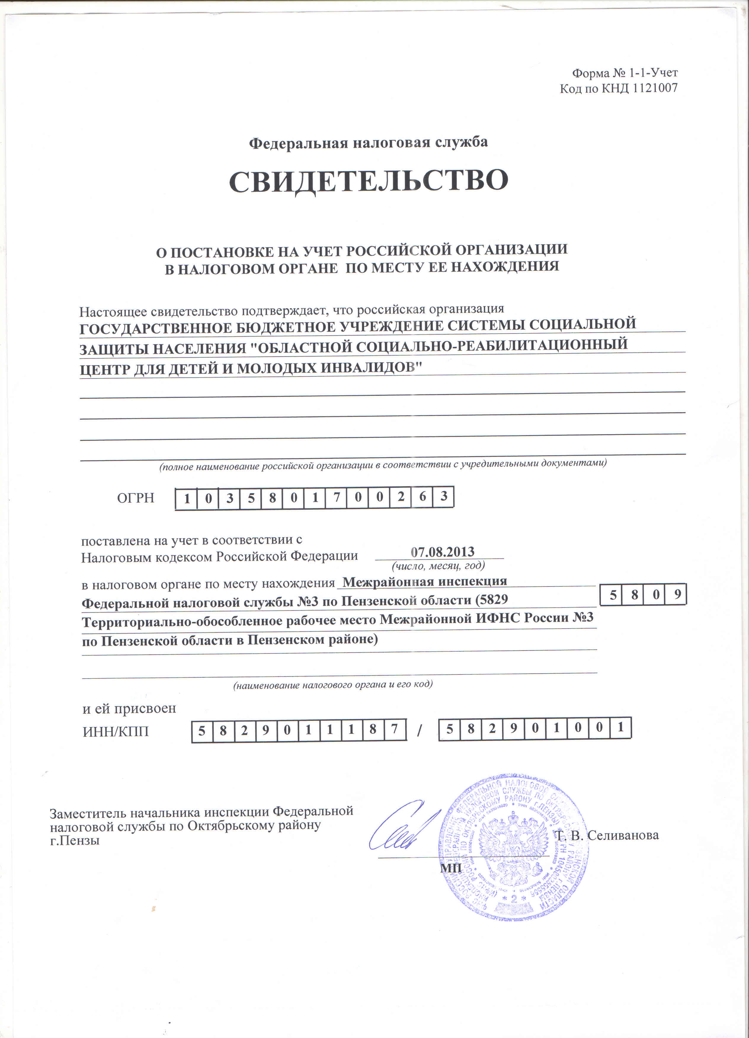 ОГРН 1035801700263, ОКТМО 56655429116
